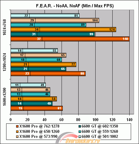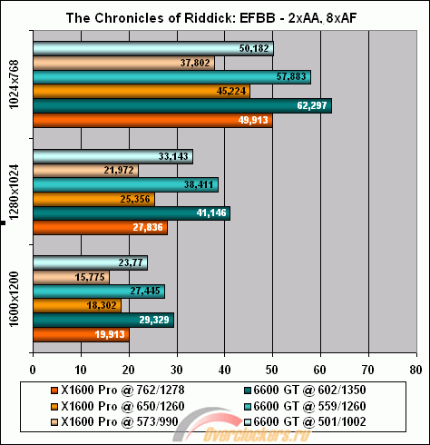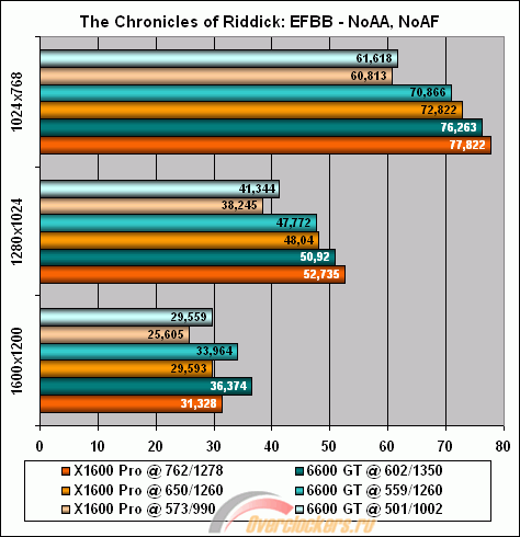 В F.E.A.R. (режим 2xAA 8xAF) и в SM3.0 тестах 3DMark06 выигрыш Palit X1600 Pro достигает более 50%, а максимальный проигрыш – более 30% в OpenGL-игре The Chronicles of Riddick.