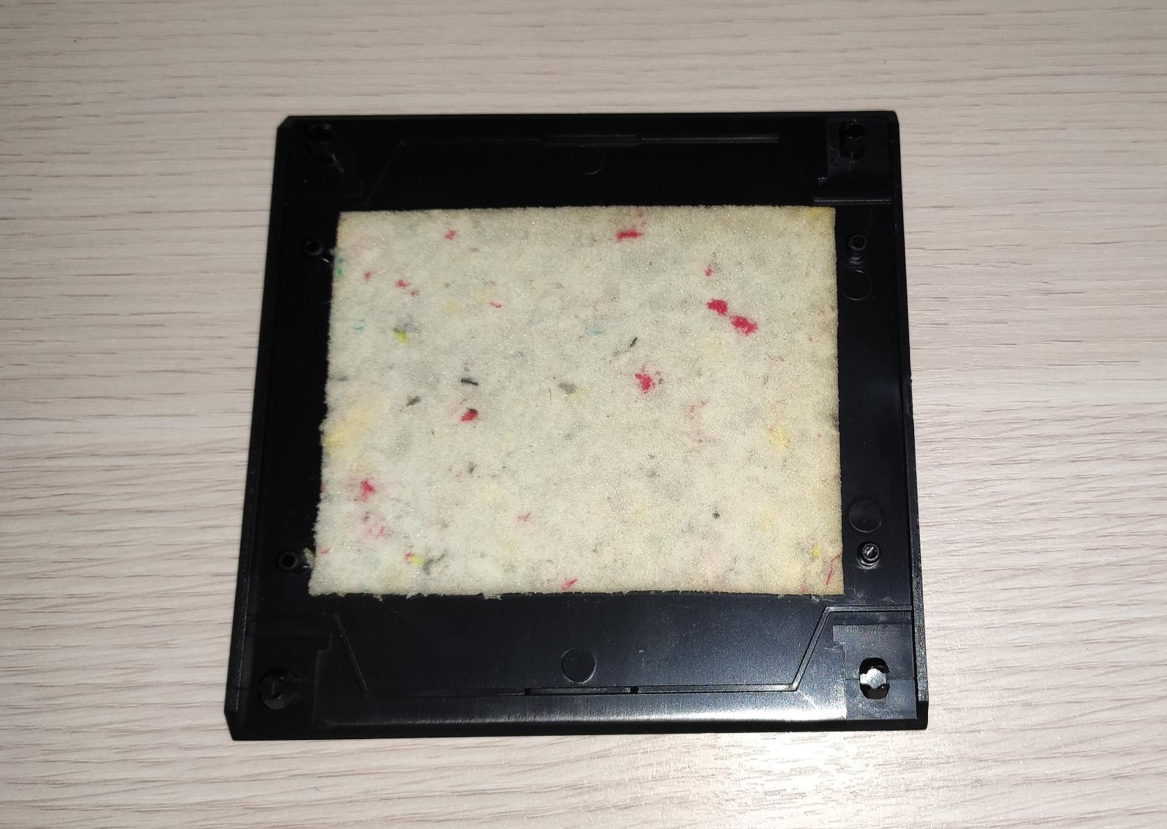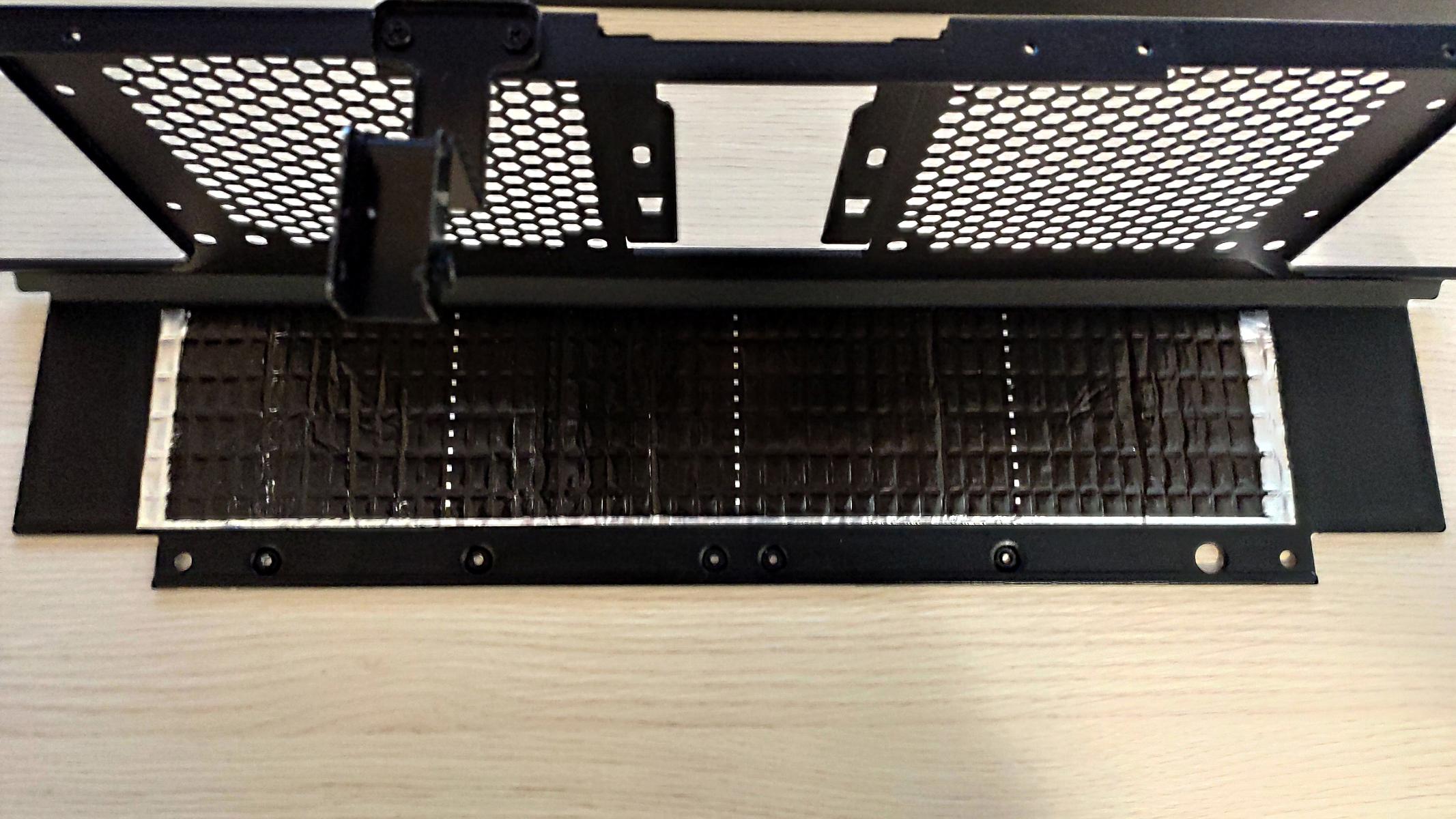 Дело в том, что у вентиляторных накладок расстояние между перфорацией и низом крышки — 3,5мм. У меня есть подходящий шумопоглощающий материал, похожий на поролон, толщиной 4мм. Если наклеить его, то для накладки будет подпор, и она дребезжать не будет, а шум, хоть немного, но загасим.