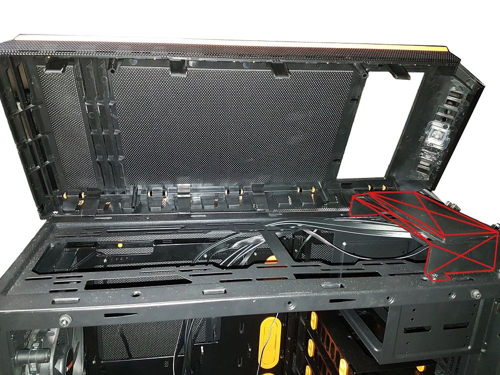 Для начала освободим место для «дыхания» одного из верхних вентиляторов. Как я писал выше, совершенно лишняя крышка перекрывает почти весь выхлоп.