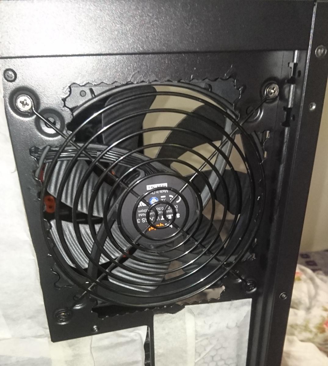 Вентилятор на задней стенке прикрыл решеткой в цвет корпуса. Необязательно, но так положено, чтобы случайно не попасть пальцами.