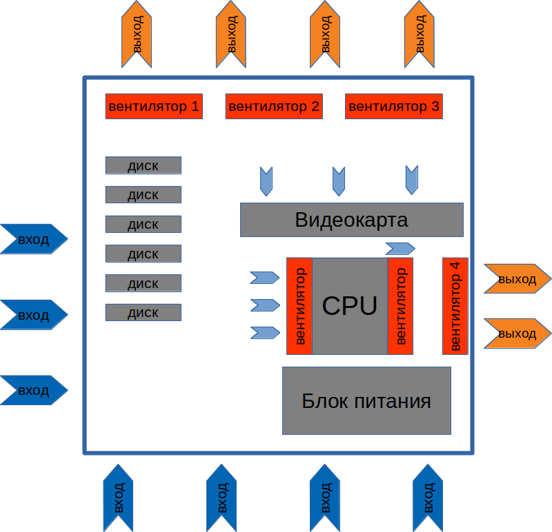В этой схеме меня сильно смущало положение вентилятора №4. Он расположен снизу, у него меньше всего «задушен» выход. Интуиция подсказывала, что если изменить направление вентилятора с «выхода» на «вход», а также поменять направление вентиляторов на радиаторе процессора, то должен быть существенный выигрыш по температурам: как минимум два-три градуса для процессора, и 3-5 градусов для видеокарты. Ведь забор воздуха будет идти почти снизу, и воздух будет попадать напрямую к процессору.
