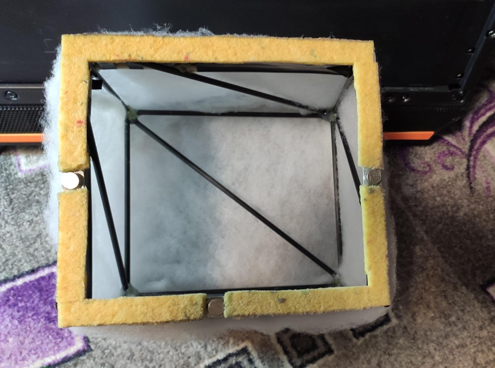 Оказывается, что сделать красивую конструкцию в режиме изоляции не так-то просто, так как закрыты почти все толковые магазины для рукоблудов. Поэтому пришлось делать доработку по дендро-фекальной технологии. Впрочем, впоследствии я не пожалел, что не стал тратить деньги. На этот раз в хозяйстве нашлось: алюминиевый уголок, пара метров карбоновой трубки, бормашина, магниты, термопистолет с китайскими соплями. Этим и решил воспользоваться. На скорую соорудил из алюминиевого уголка и карбоновых трубок каркас, скрепил его с помощью термосоплей и обтянул синтепоном. На вид получилось, скажем так, не очень.