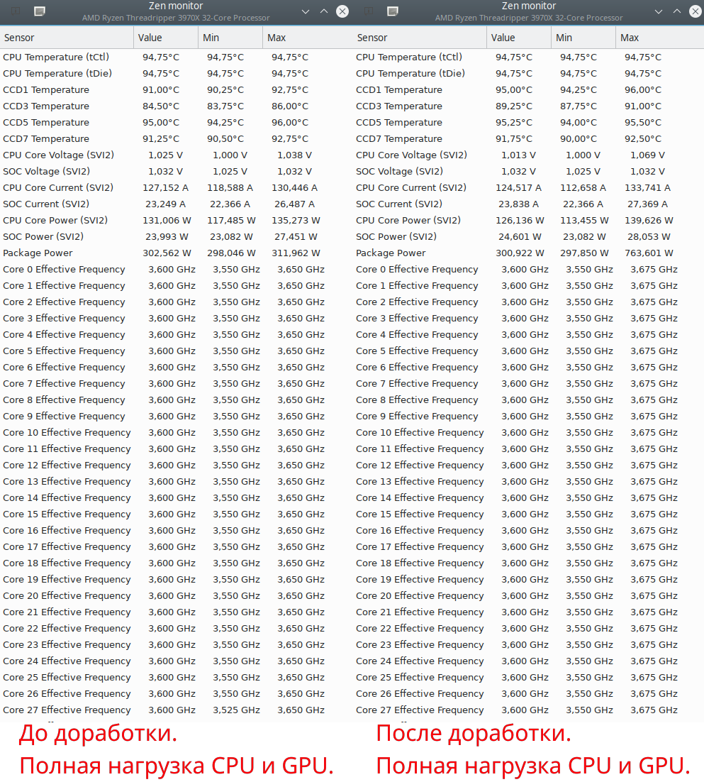 Признаюсь честно, что давно не испытывал такого глубокого разочарования от своей интуиции. Как видно из снимков экрана температуры вообще не изменились. При этом, можно сказать, что в варианте «ДО» температура GPU была на градус ниже. В рабочих нагрузках температура и частоты процессорных ядер вообще никак не изменились.