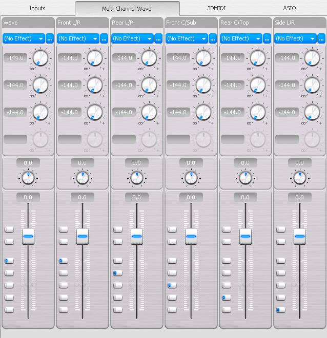 Здесь представлены стрипы выходных каналов. Когда какой-либо плеер воспроизводит звук через карту, этот звук проходит через данные стрипы, если только не используется ASIO или MIDI. Стрип wave отвечает за стерео сигнал от программ, не инициализировавших многоканальный выход. На практике это почти никогда не случается, большинство программ даже при воспроизведении стерео делают это через многоканальный интерфейс, задействуя переднюю пару каналов (стрип front l/r). На данной закладке каждый стрип имеет регуляторы уровня, роутинга и отключения только в единственном экземпляре, общем на оба канала. Как и в случае с опциями роутинга, здесь присутствует несуществующая физически пара каналов rear c/top в виде отдельного стрипа. По умолчанию роутинг настроен так, чтобы не вносить изменений, например, сигнал стрипа rear l/r отправляется на выход rear l/r. Но его можно перераспределить в любых комбинациях.