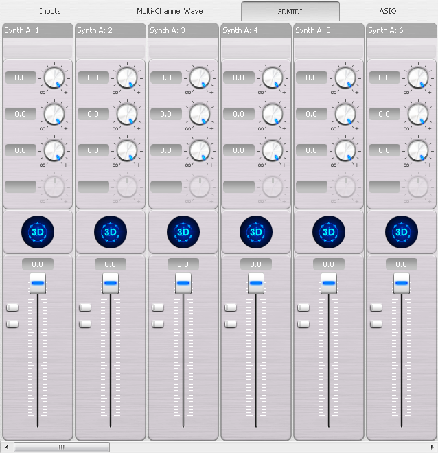 Здесь каждый стрип соответствует каналу миди-синтезатора, по 16 на синтезаторы A и B. Во время воспроизведения MIDI-файлов с помощью собственного синтезатора карты заголовки стрипов меняются на названия инструментов, которые в данный момент назначены соответствующим каналам. Для MIDI не поддерживаются insert-эффекты и усиление сигнала (100% регулятора соответствуют 0 db). Регуляторы баланса и роутинга заменены кнопками 3D.