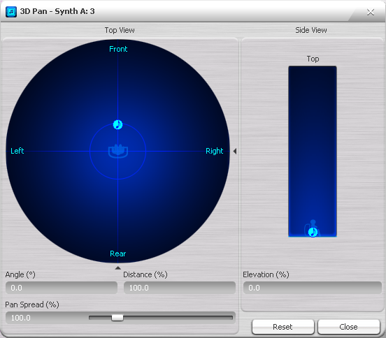 В этом окне можно перемещать в пространстве инструмент, играющий через связанный канал MIDI. Регулятор распределения (pan spread) размывает источник звука в пространстве. Кнопка reset сбрасывает положение в стандартное, close закрывает с текущими настройками.