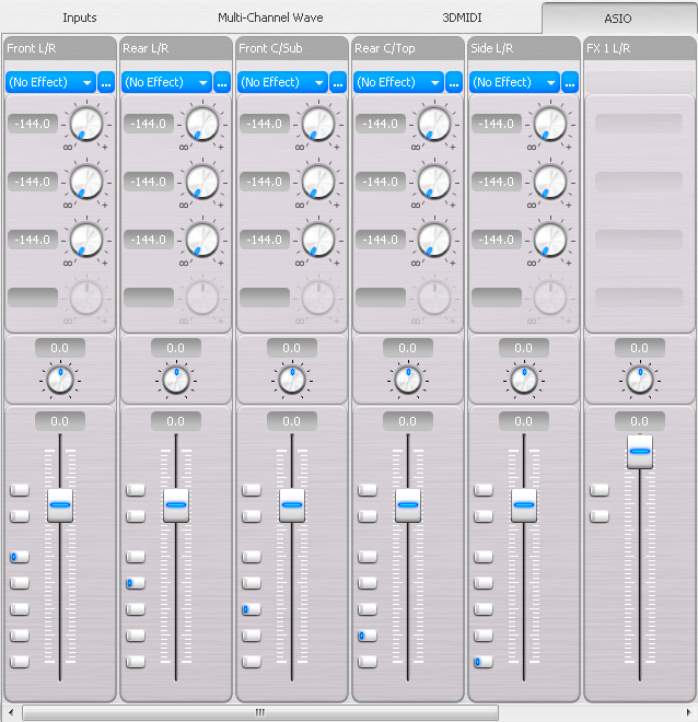 Здесь представлены выходные каналы ASIO. Вцелом, похоже на multi-channel wave, только отсутствует стрип wave. Также, здесь есть 4 уникальных стрипа, fx 1-4 l/r. У них не регулируется уровень подачи aux (он всегда полный) и роутинг (их сигнал никогда не идет на выходы), не поддерживаются insert-эффекты и усиление сигнала (100% регулятора соответствуют 0 db). Задача стрипов fx — облегчить использование карты в качестве внешнего эффект-процессора в аудиоредакторах с поддержкой ASIO. Для этого aux-эффект настраивается как обычно, но не включается ни для одного из стрипов, а роутинг результата (раздел master auxiliary effects) настраивается на неиспользуемую в данный момент пару, здесь может пригодиться физически отсутствующий rear c/top. В аудиоредакторе выставляется вывод трека с dry-сигналом на fx 1-4 l/r, а запись нового трека под wet-сигнал с ранее задействованной в роутинге пары каналов. После этого запускается одновременное воспроизведение трека с dry и запись с wet.