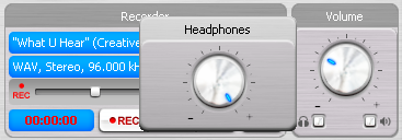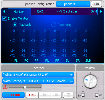 Расположенный наверху блока выпадающий список speaker configuration позволяет выбрать желаемый режим акустики. Кнопка справа от него вызывает THX Console (на некоторых картах она называется Speaker Setup Console), которая описана в собственной части руководства. В отдельных случаях выбор акустики заблокирован и возможен только через панель управления Windows. Разблокировка полноценного выбора описана в разделе прочих настроек. Ниже находится синий «экран» с несколькими закладками. В данном случае активна первая закладка, мониторинг (monitor). На ней находятся пикметры для различных каналов, мониторинг можно включать/выключать или выбирать режим слежения за воспроизведением (playback) или записью (record). Еще ниже расположены блоки встроенной утилиты записи (recorder) и регулятора громкости (volume). Утилита записи позволяет выбирать активный вход, формат записи и ее уровень. Выбор входа и уровня влияет и на другие программы записи, в том числе на голосовое общение. Здесь полным уровнем громкости является 50%. Все, что выше — усиление, не рекомендуется использовать во избежание появления перегрузок и искажений сигнала. Помимо физических входов в списке присутствует what u hear. С него записываются воспроизводимые через акустику звуки, при этом регулятор общего уровня громкости воспроизведения не влияет на уровень сигнала на этом входе. В самом низу расположены индикатор времени записи, кнопки записи, воспроизведения ранее записанного, остановки и показа списка сделанных записей. В конце каждой записи предлагается выбрать имя и место сохранения файла. Под регулятором общей громкости имеются кнопки установки относительной громкости выхода на наушники и отключения звука.