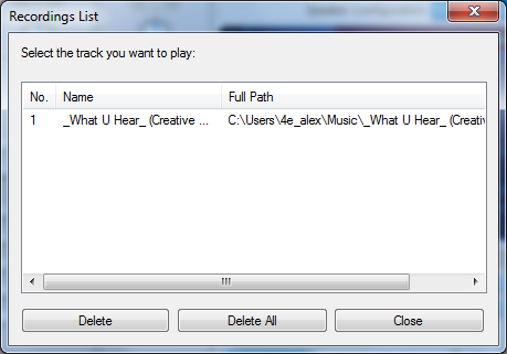 Отображается при нажатии кнопки в правом нижнем углу встроенной утилиты записи. Отсюда двойным щелчком можно выбрать файл для воспроизведения, а также удалить одну (delete) или все (delete all) записи из списка (файлы остаются на диске).<br/>