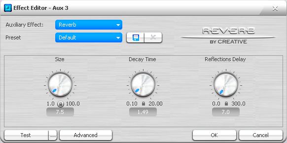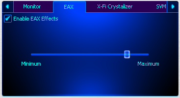 В действительности это глобальный переключатель и регулятор уровня aux 1. На другие aux и любые insert эти опции не влияют. Т.к. EAX в играх — это в основном и есть загруженная в aux 1 реверберация, только с управляемыми игрой по ее внутренней обстановке параметрами, то эта настройка влияет и на игры. В любом случае запуск игр в Audio Creation Mode не рекомендуется.<br/>