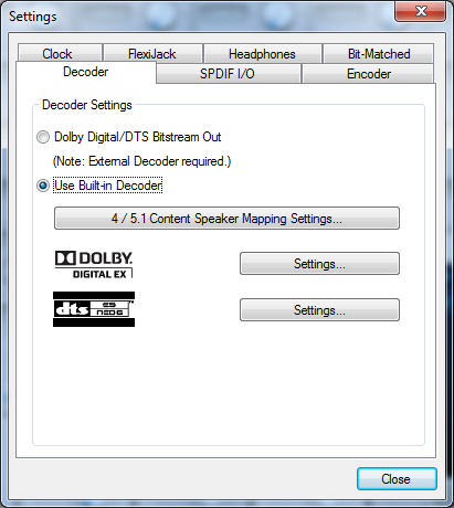 Вверху находится переключатель выключения (dolby digital/dts bitstream out) или включения (use built-in decoder). Когда декодер выключен, карта работает как любая другая — посланный плеером на S/PDIF закодированный поток отправляется в нетронутом виде на ресивер/акустику с цифровым входом. Когда декодер включен, посланный на S/PDIF закодированный поток декодируется встроенным в драйвер декодером и отсылается на аналоговые выходы со всеми включенными обработками, подобно любому другому многоканальному звуку. С S/PDIF выхода карты при этом идет стереосигнал в формате PCM. Декодеры Dolby и DTS включаются и отключаются вместе, не может быть включен только один из них. Декодеры и энкодер не могут работать одновременно, включение декодеров выключает энкодер. Нажатие на логотипах Dolby и DTS вызывает информацию об авторских правах и патентах.