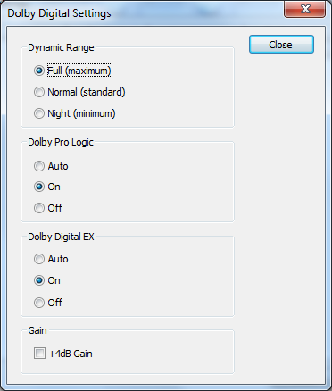 Вверху находится выбор динамического диапазона (dynamic range), определяющий разницу между самыми громкими и самыми тихими звуками, от максимума (full), до минимума/ночного режима (night). Ниже переключатели определения и декодирования матричных каналов. Матричные каналы — это каналы, закодированные в другие, не имеющие в воспроизводимом файле своих собственных отдельных треков. Dolby Pro Logic использует 2 реальных канала для хранения информации о 4, а Dolby Digital EX использует 6 каналов (5.1) для хранения 7 (6.1) или 8 (7.1). Значение off выключает декодирование матричных каналов. Auto включает его, если декодером такие каналы найдены. On означает, что 2- и 6-канальные записи Dolby всегда будут доводиться до уровня установленной акустики (функция почти аналогична раскладке стерео в многоканал посредством CMSS, только для форматов Dolby). В самом низу имеется опция увеличения уровня (gain) декодированного сигнала.