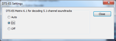 Здесь расположен переключатель определения и декодирования матричных каналов. DTS-ES Matrix использует 6 каналов (5.1) для хранения 7 (6.1). Значение off выключает декодирование матричных каналов. Auto включает его, если декодером такие каналы найдены. On означает, что 6-канальные записи DTS всегда будут доводиться до уровня установленной акустики (функция почти аналогична раскладке стерео в многоканал посредством CMSS, только для форматов DTS).