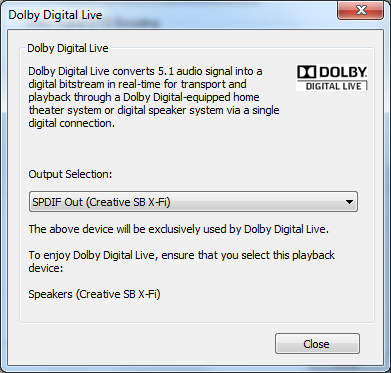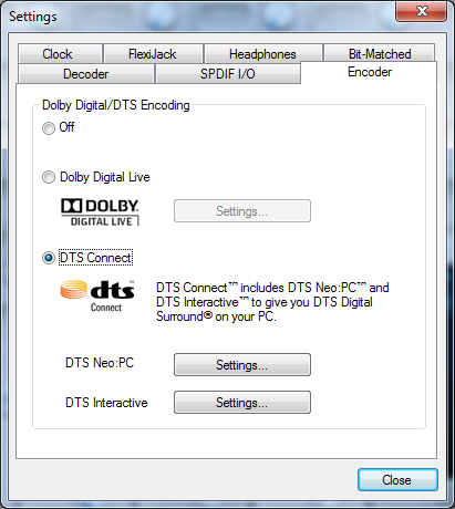 Энкодеры кодируют многоканальный звук в форматы Dolby и DTS с целью передачи более двух каналов через S/PDIF. Необходимость вызвана тем, что стандартом S/PDIF предусмотрена передача только двух каналов в формате PCM, т.е. в обычном виде. Многоканальный звук можно передать только с помощью кодирования в форматы с потерями данных от Dolby и DTS. Формат DTS более качественный, но поддерживается меньшим числом ресиверов, чем Dolby. На этом экране можно выбрать метод кодирования: off (выключено, передача стерео PCM), Dolby Digital Live или DTS Connect. Включение энкодера автоматически переключает режим акустики на 5.1. Декодеры и энкодер не могут работать одновременно, включение энкодера выключает декодеры. Нажатие на логотипах Dolby и DTS вызывает информацию об авторских правах и патентах. Имеется 3 кнопки settings для вызова настроек Dolby Digital Live, DTS Neo:PC и DTS Interactive.