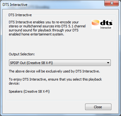 DTS Interactive — основная часть DTS Connect и отвечает за собственно кодирование. Здесь в выпадающем списке можно выбрать цифровой выход, который будет использоваться для вывода. В самом конце текста указано устройство, на которое надо отправлять исходный многоканальный звук, оно должно быть выбрано основным в настройках Windows и программ (если такая опция в них имеется).<br/>