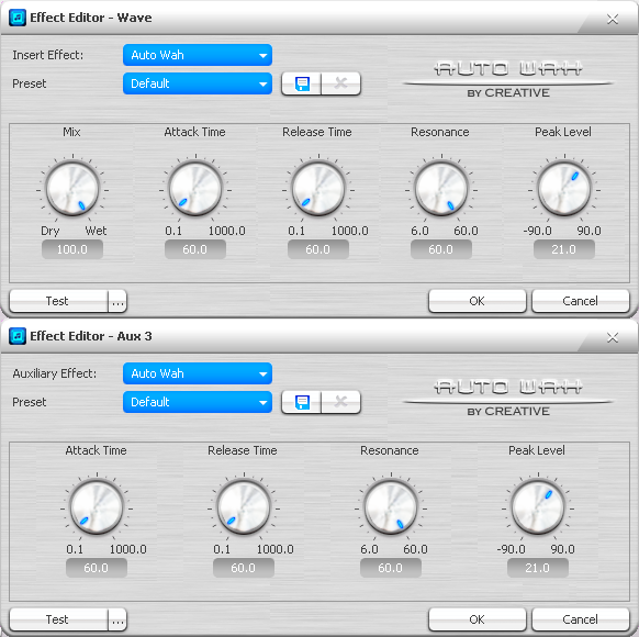 Ниже собраны все экраны настроек эффектов и даны краткие описания. Данное руководство не ставит целью рассказать обо всех тонкостях и научить пользоваться эффектами на уровне профессионала. Во всех случаях, когда на одной картинке склеены 2 варианта одного окна, верхний относится к insert-версии эффекта, а нижний к aux. При этом разница обычно заключается в наличии регулятора баланса wet-dry у insert-версии. Общие сведения о wet и dry были даны выше. Первый эффект называется auto wah: