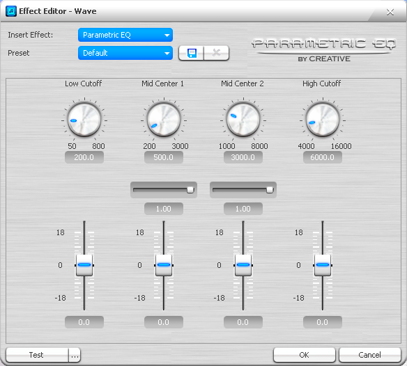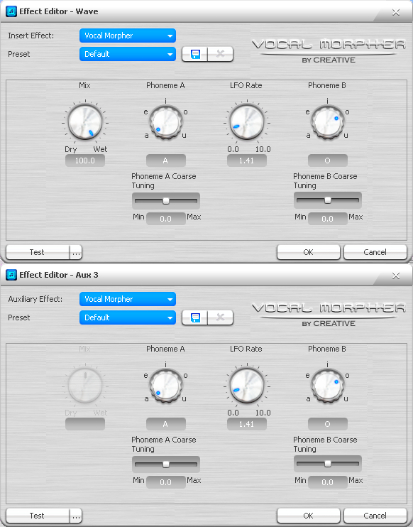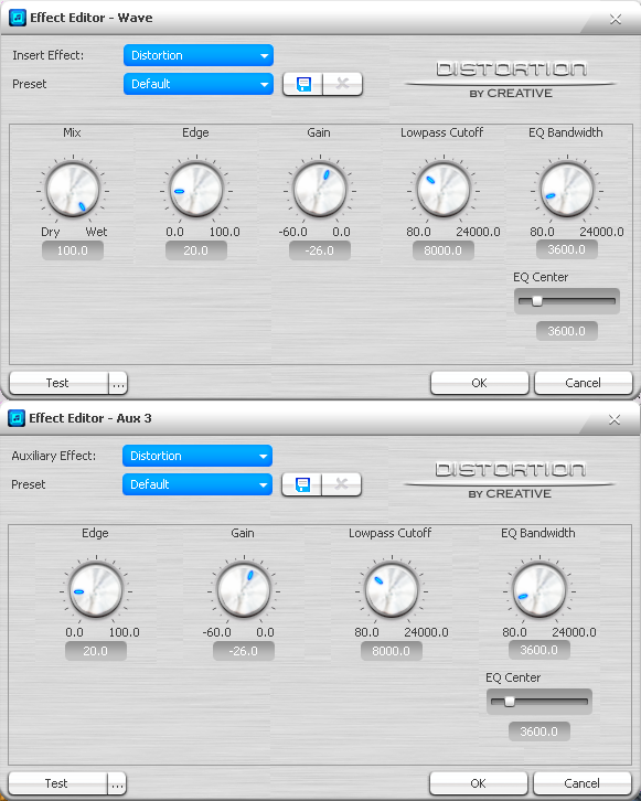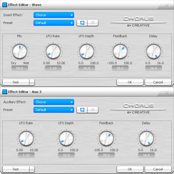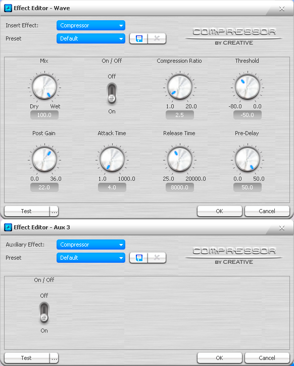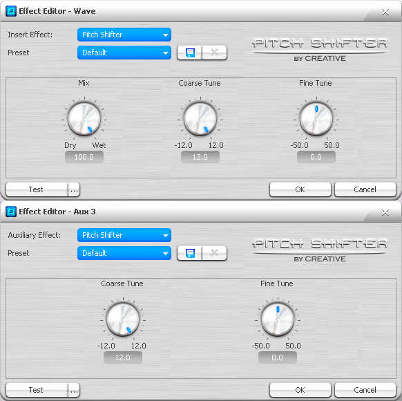 Сверху окна редактора эффектов всегда присутствуют выпадающие списки для смены эффекта и выбора заготовки (preset). Можно сохранять и удалять собственные пресеты. При нажатии кнопки закрытия редактора с оставлением изменений (ok) появляется запрос на сохранение значений в качестве заготовки. Слева внизу имеется кнопка прослушивания эффекта (test) с возможностью выбрать собственный тестовый звук (кнопка с многоточием). Любые изменения в настройках эффектов вступают в силу незамедлительно, поэтому их можно проверять и на входящем или проигрываемом сигнале.