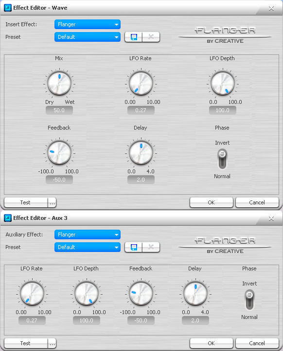 Основан на добавлении копии сигнала с меняющейся задержкой и другими изменениями, например, перевернутой фазой. Для правильной работы данного эффекта wet и dry должны играть одновременно.