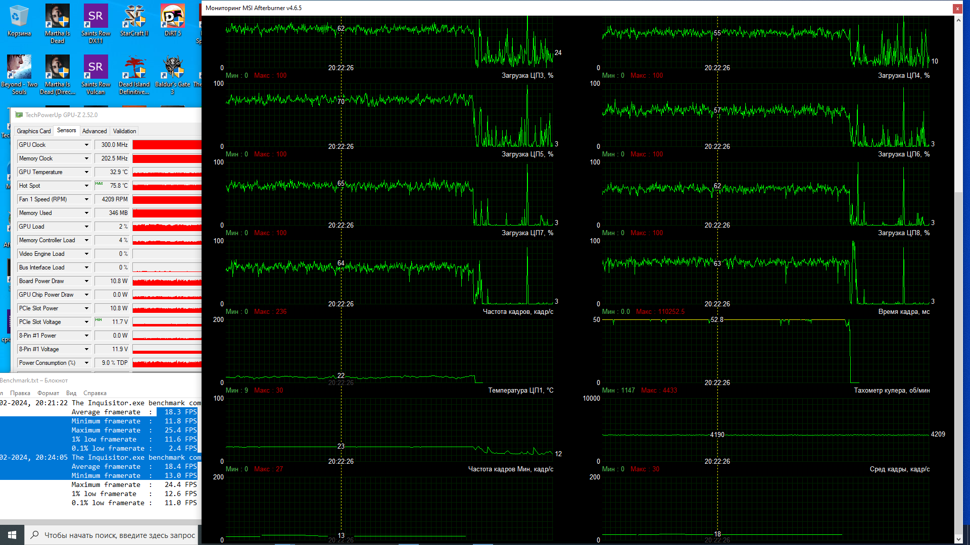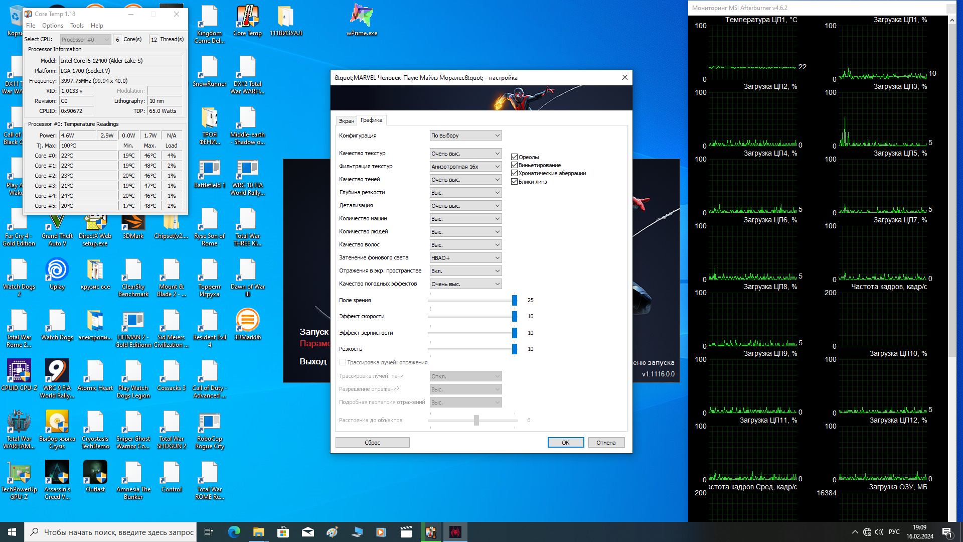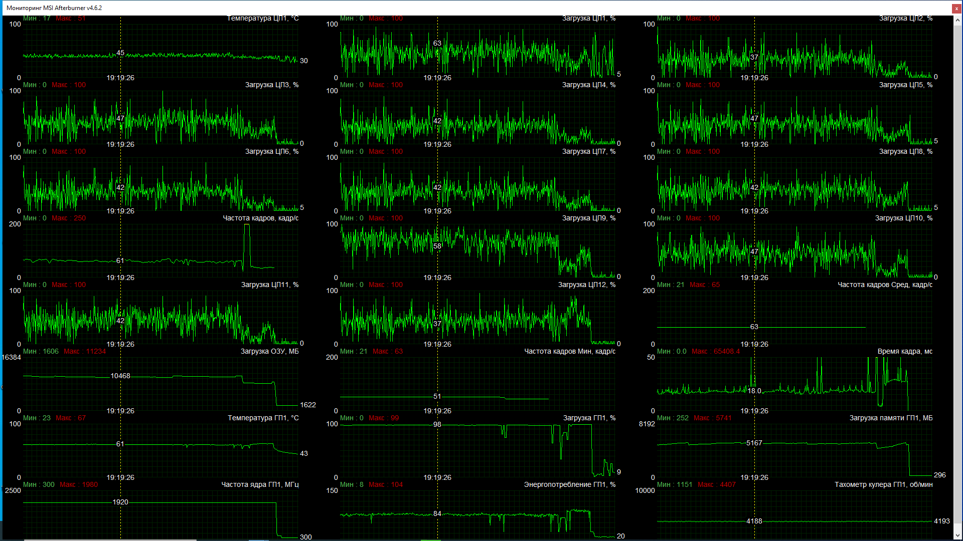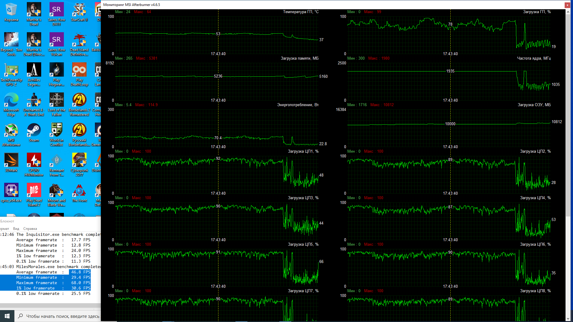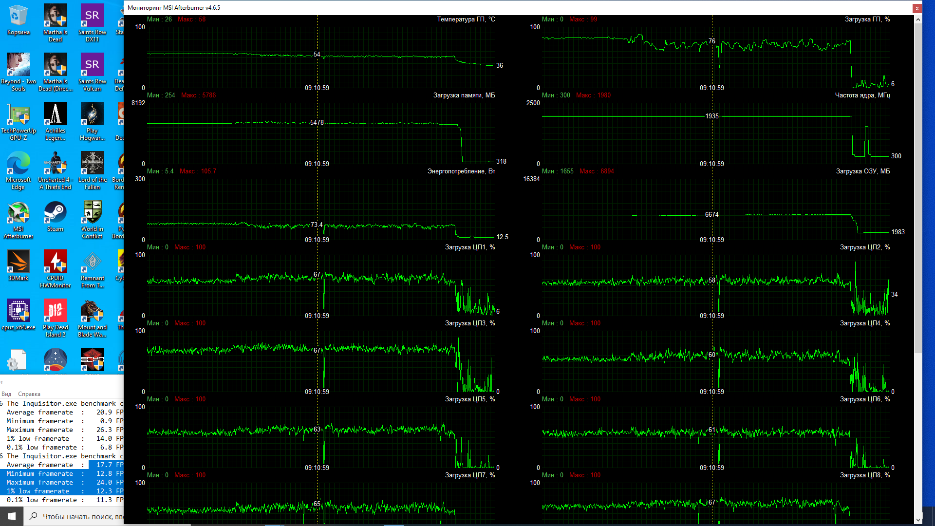 ось win 10 , msi afterburner v 4.6.5 для мониторинга загрузки процессора и видеокарты