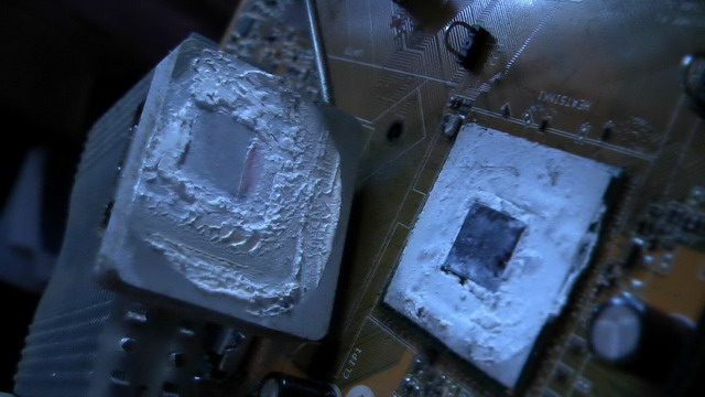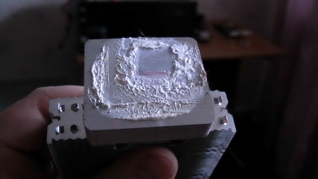 Основательно подзасохщую термопасту АЛСИЛ-5, которая вообще то не должна сохнуть. Но тем не менее совершенно чётко видно что она собралась в "островки".