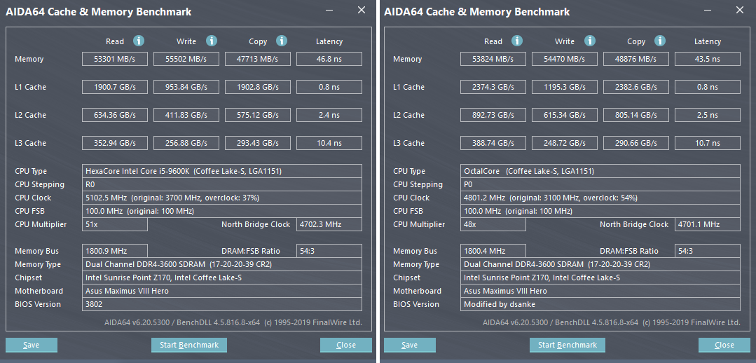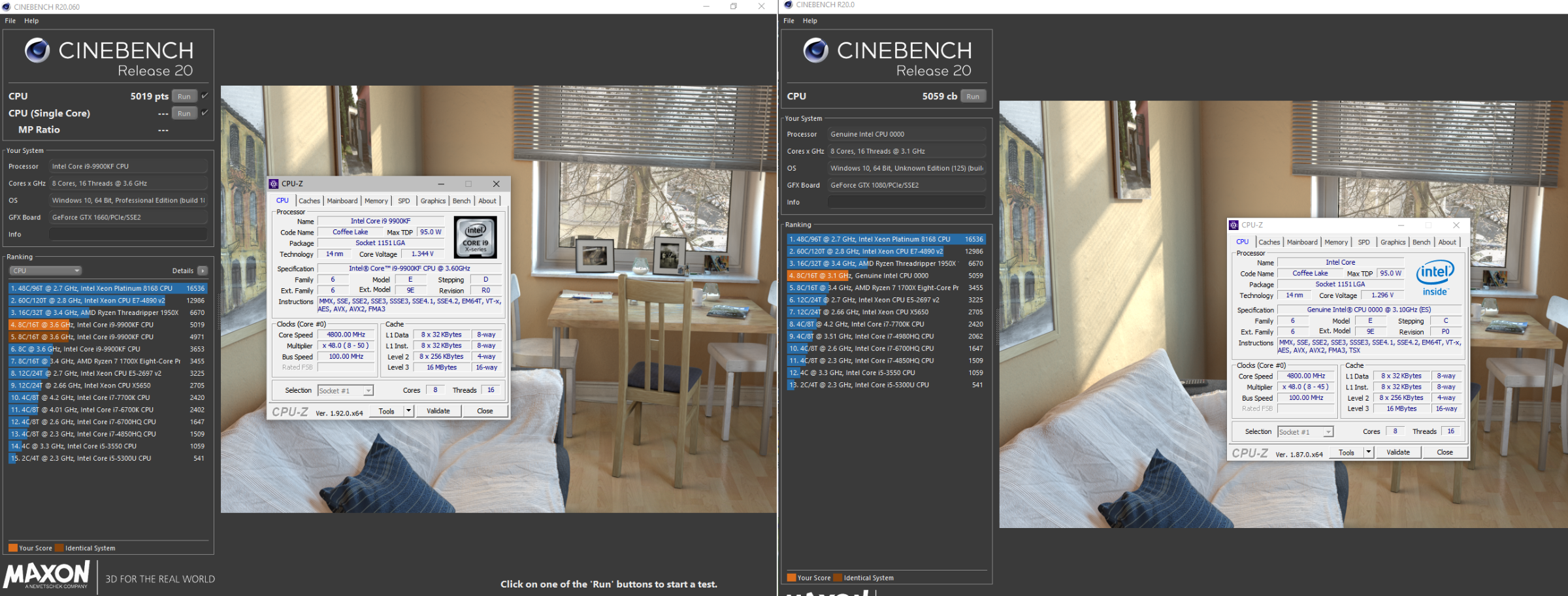 Разогнав процессор, мне захотелось убедиться, что производительность инженерного образца не отличается от серийных процессоров. К сожалению, провести полноценное сравнение в играх и софте я не могу, однако, я попросил одного человека прогнать для меня бенчмарки CINERBENCH R15 и CINERBENCH R20 на серийном 9900KF на тех же 4.8GHz. Как вы можете убедиться, результаты тестов между процессорами не отличаются (Крайне небольшая разница вызвана тем, что у меня выключены все фиксы уязвимостей, а windows не обновляется. Пользователь 9900KF же, как положено, имеет систему с заплатками от SpectreMeltdown и обновлениями)