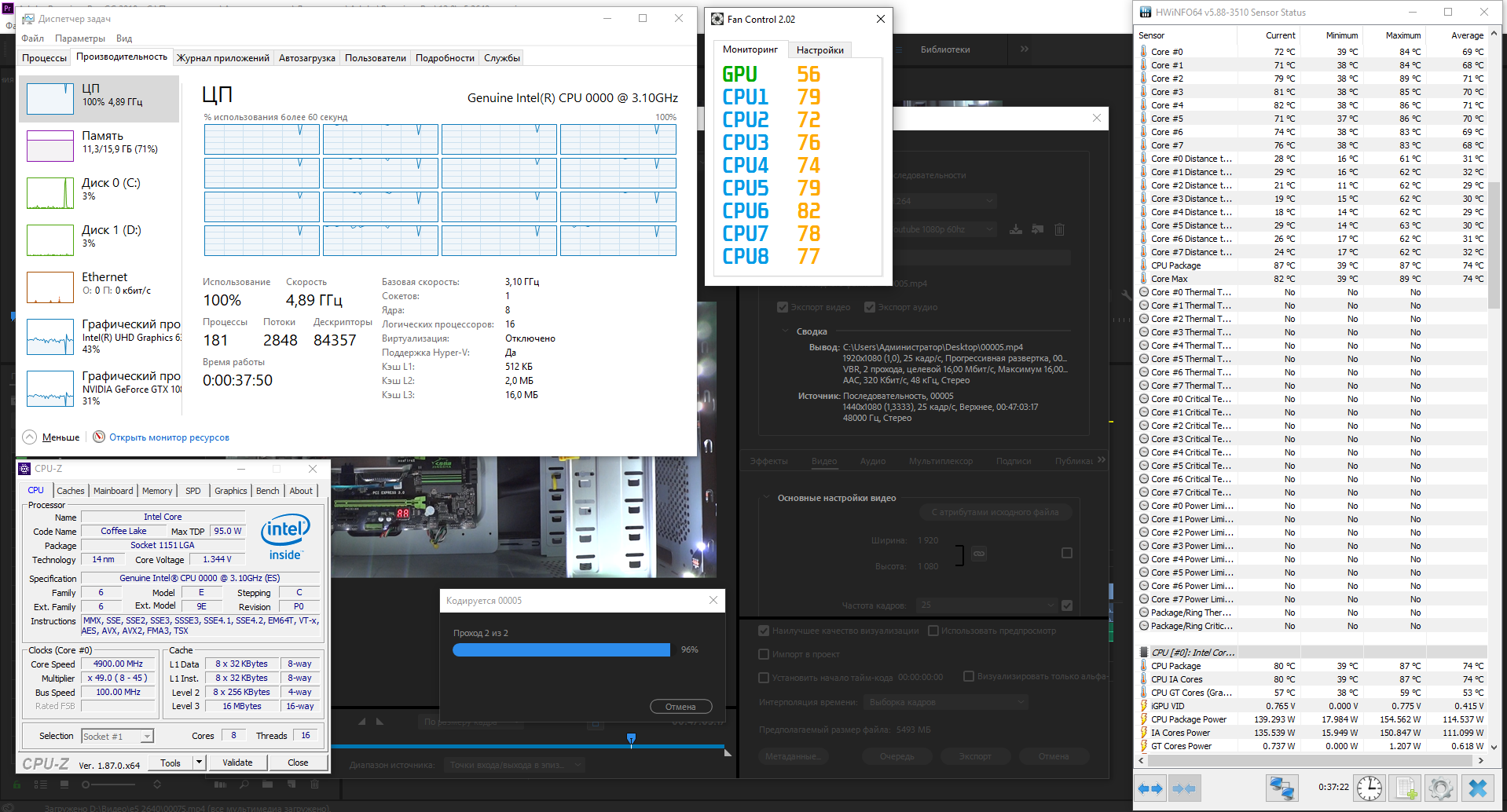 Таким же способом я решил перепроверить напряжения, полученные в результате тестирования линпаком. Протестировать решил частоту 4.9, но поскольку моя СО не позволяет гонять 4.9 со столь высоким, в 1.37v, напряжением, и поскольку напряжения необходимые для линпака обычно избыточны, я выставил 4.9GHz, 1.35v, и успешно отрендерил тестовое видео длительностью в 40 минут и объёмом 6гб. Рендер занял порядка получаса времени: