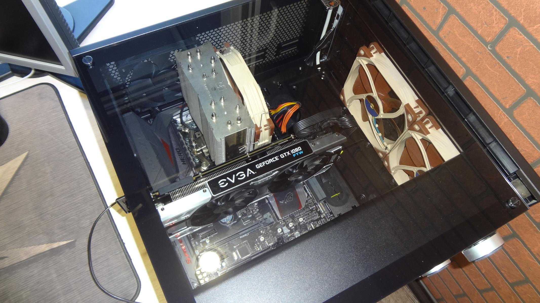 Ах да, матплата, Maximus VIII Hero, показала себя прекрасно, максимальная температура зоны VRM по встроенным датчикам, которую мне удалось засечь в самых тяжелых условиях, составляла порядка 80 градусов. При более лёгких режимах тестирования радиаторы платы без проблем можно держать рукой.