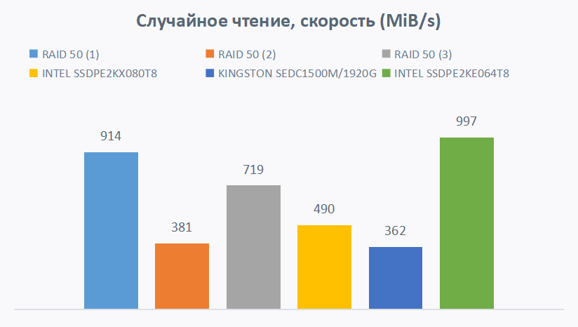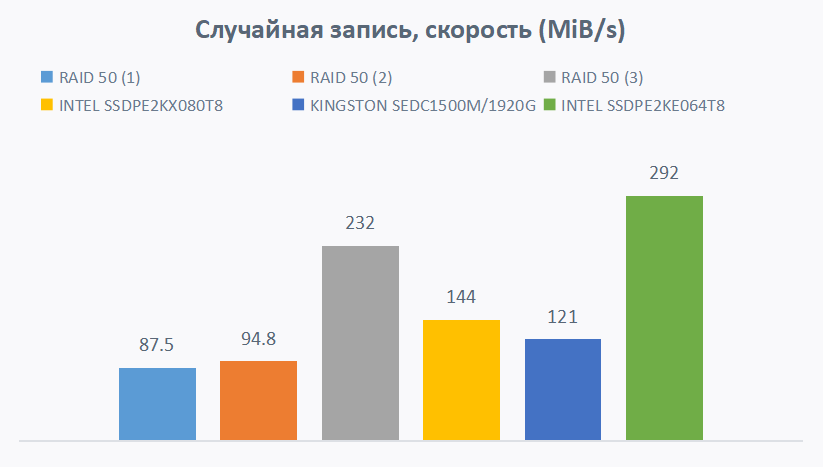 | HARD RAID 50 (1), 8 SSD (INTEL SSDSC2KB019TZ) | 234 | 914 | 22,4 | 87,5 | 126 | 366,5 | 170 MB/s | 1,3 GB/s |