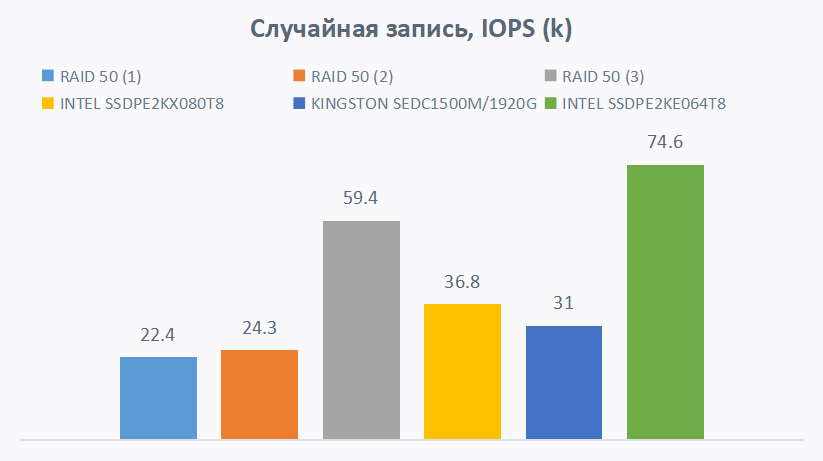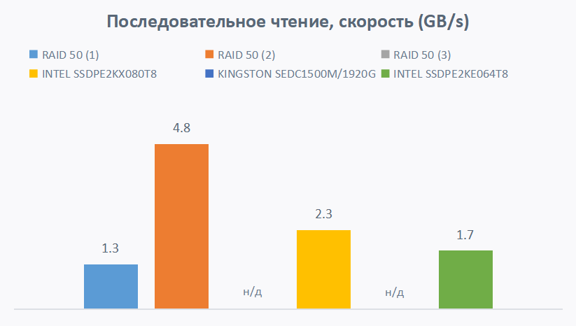 Были протестированы два массива RAID-50 по 8 SSD INTEL D3-S4520 1.92Tb SATA 6GB/s (SSDSC2KB019TZ) и один RAID-50 из 6 SSD INTEL DC-S3500480GB SATA 6Gb/s (SSDSC2BB48), результаты занесены в таблицу: