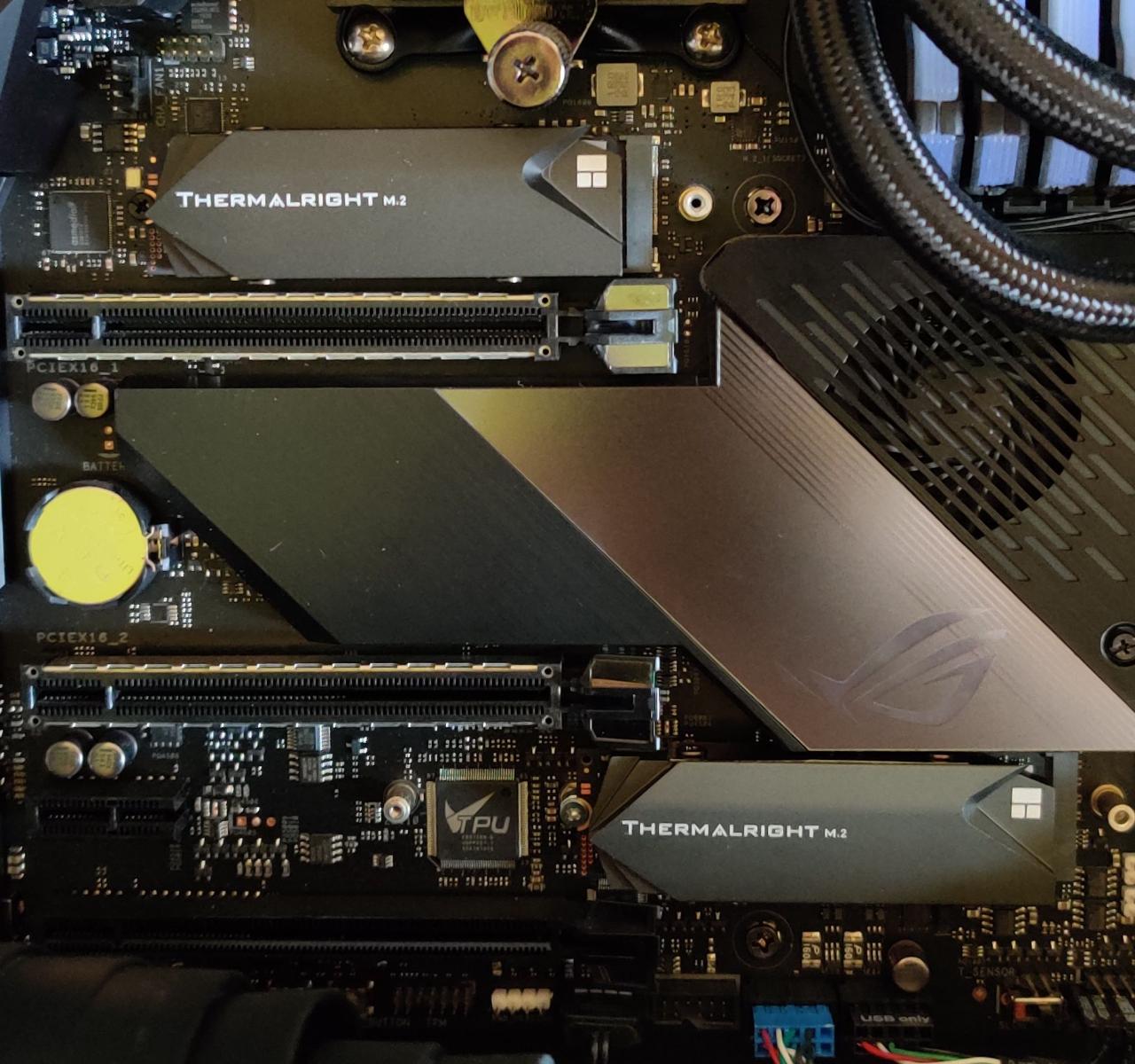Вчера установил радиаторы Thermalright на оба SSD М2, выигрыш по температуре небольшой (4-5 гр). Можно было бы и без них обойтись, теми радиаторами что с материнкой идут, но когда эти радиаторы заказывал, SSD очень сильно грелись от двух карт 1080Ti в SLI что у меня тогда стояли, и скорых планов на их замену на одну 2080Ti тогда еще не было. Ну раз пришли, установил: