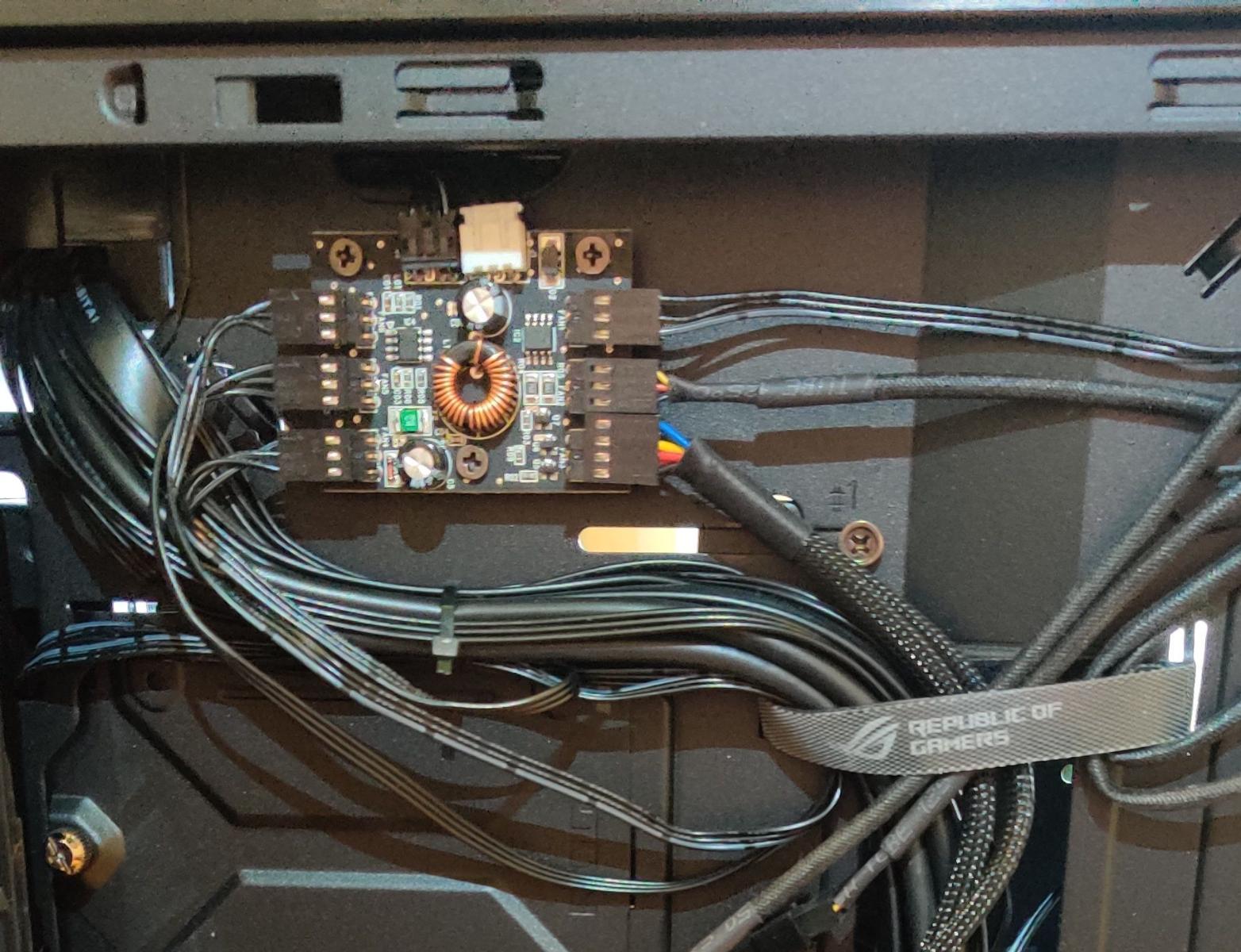 Вообще, дизайн дело вкуса, главное что мне он понравился и другого который бы меня так зацепил сначала внешне а потом внутри, я не нашел. Стекло и метал, довольно тяжелый, около 18 кг. Внутри корпуса уже предустановлено 4 тихих 140 мм вентилятора ASUS ROG A1425L125 (один сзади, три на фронтальной панели) к которым я сразу еще заказал 3 шт. 120 мм Noctua NF-F12 industrialPPC-2000 на верхнюю панель. Забегая вперед, трехсекционную водянку изначально планировал ставить на фронтальную панель. Каждый вентилятор подключен к плате-контроллеру, которая по совместительству отвечает и за светодиодную подсветку, дополнительные кулеры Noctua также будут потом подключены к этому контроллеру:
