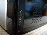 Кнопки включения и внешние разъемы располагаются на правой грани передней панели. Кнопки включения и сброса находятся сверху, а аудиоразъемы и 2 USB-порта снизу. Кроме того здесь же имеется прорезь для порта Firewire, отсутствующего в данной комплектации. Кнопка сброса выполнена легкодоступной, однако, ее размер исключает вероятность случайного нажатия. Расстояние между USB-разъемами невелико и одновременная работа двух "пухлых" флешек может быть затруднена.