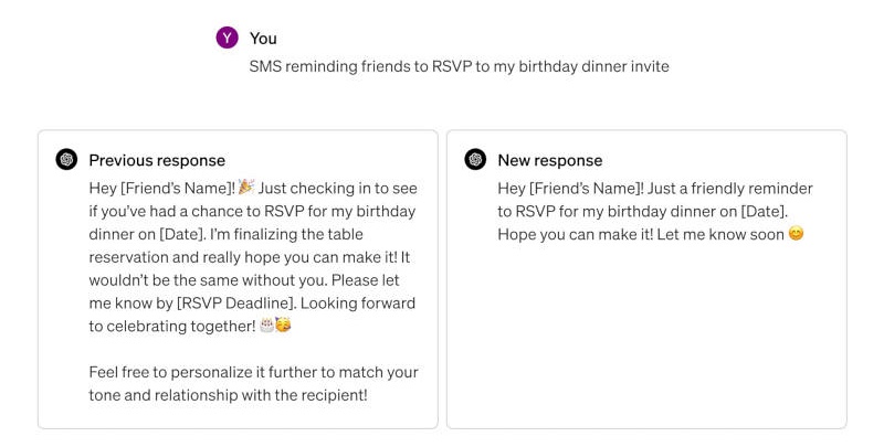 Также обновлённый ChatGPT в отдельных случаях постарается не лить на пользователя слишком много «воды», если ситуация позволяет ответить разумно и коротко. Вдобавок умный бот реже будет использовать длинные фразы, повторять фрагменты пользовательского запроса, вместо чего постарается отвечать более простым разговорным языком.