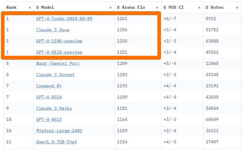 Впрочем, лидерство Claude 3 даже на одной из сравнительных площадок оказалось недолгим. Новая GPT-4 2024-04-09 сразу же после своего выхода сумела перехватить инициативу в голосовании пользователей и с минимальным отрывом вернуть OpenAI первое место.