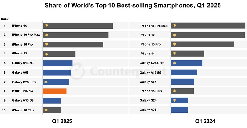 Аналитическое агентство Counterpoint Research сегодня поделилось новой статистикой, в которой раскрывает самые продаваемые модели смартфонов за первый квартал 2025 года.