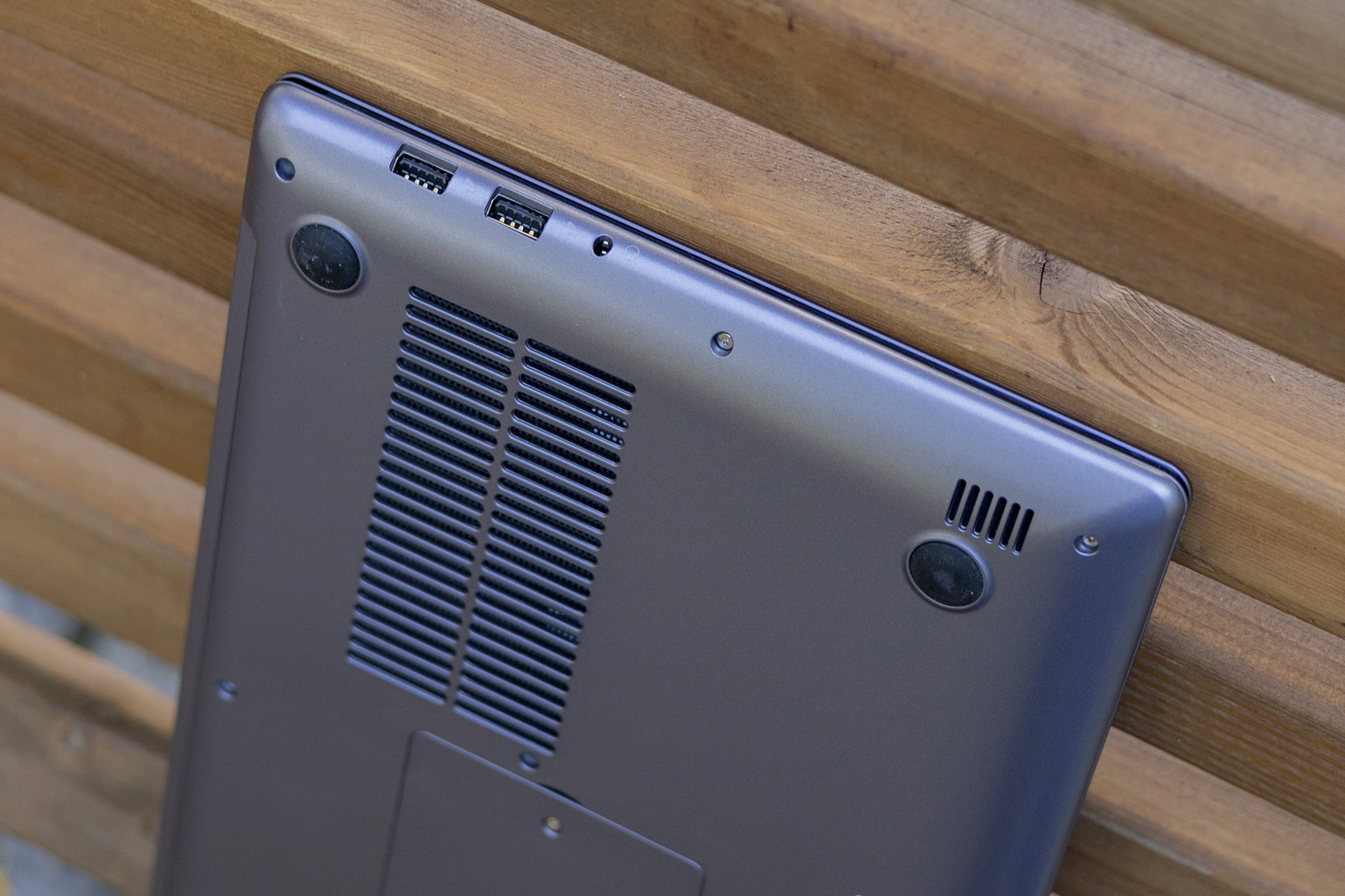 На нижней стороне есть вентиляция, стереодинамики, резиновые ножки и наклейки с информацией. Звук из динамиков не сказать, что отличается высоким качеством, но, по крайней мере, его громкости хватает для небольших помещений.