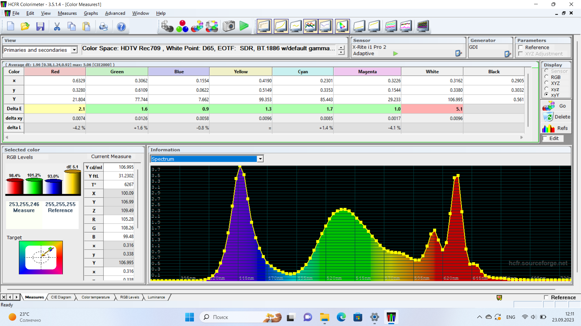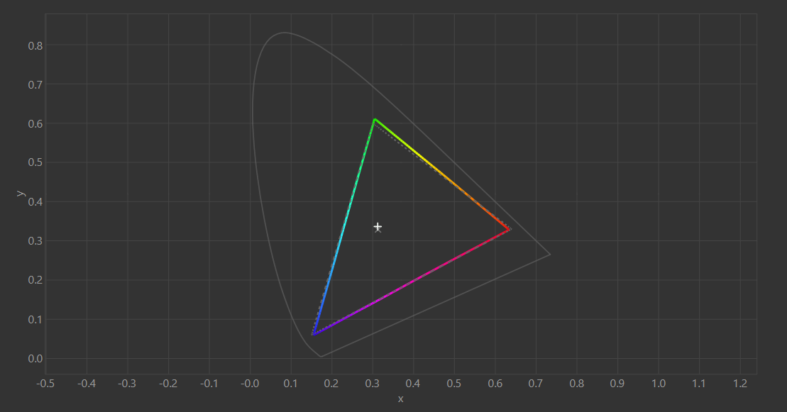 Спектры компонент говорят о том, что в теории матрица способна поддерживать расширенный цветовой охват, однако он скорректирован до границ sRGB, что в данном случае можно назвать правильным решением, обеспечивающим более точную цветопередачу.