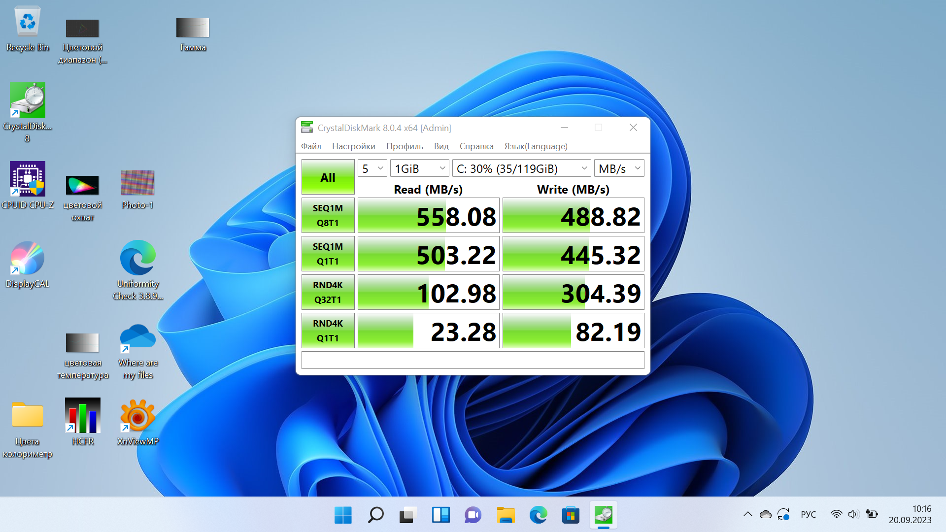 На момент написания обзора Ninkear N14 Pro продавался в двух версиях, которые отличались только объёмом SSD M.2 SATA-накопителя – это 512 либо 1024 ГБ, из которых тестируется первый, чуть более простой вариант. Скорости чтения и записи явно не самые высокие, но в целом стандартные для такого типа SSD. Зато возможна замена на накопитель ёмкость до 4 ТБ.