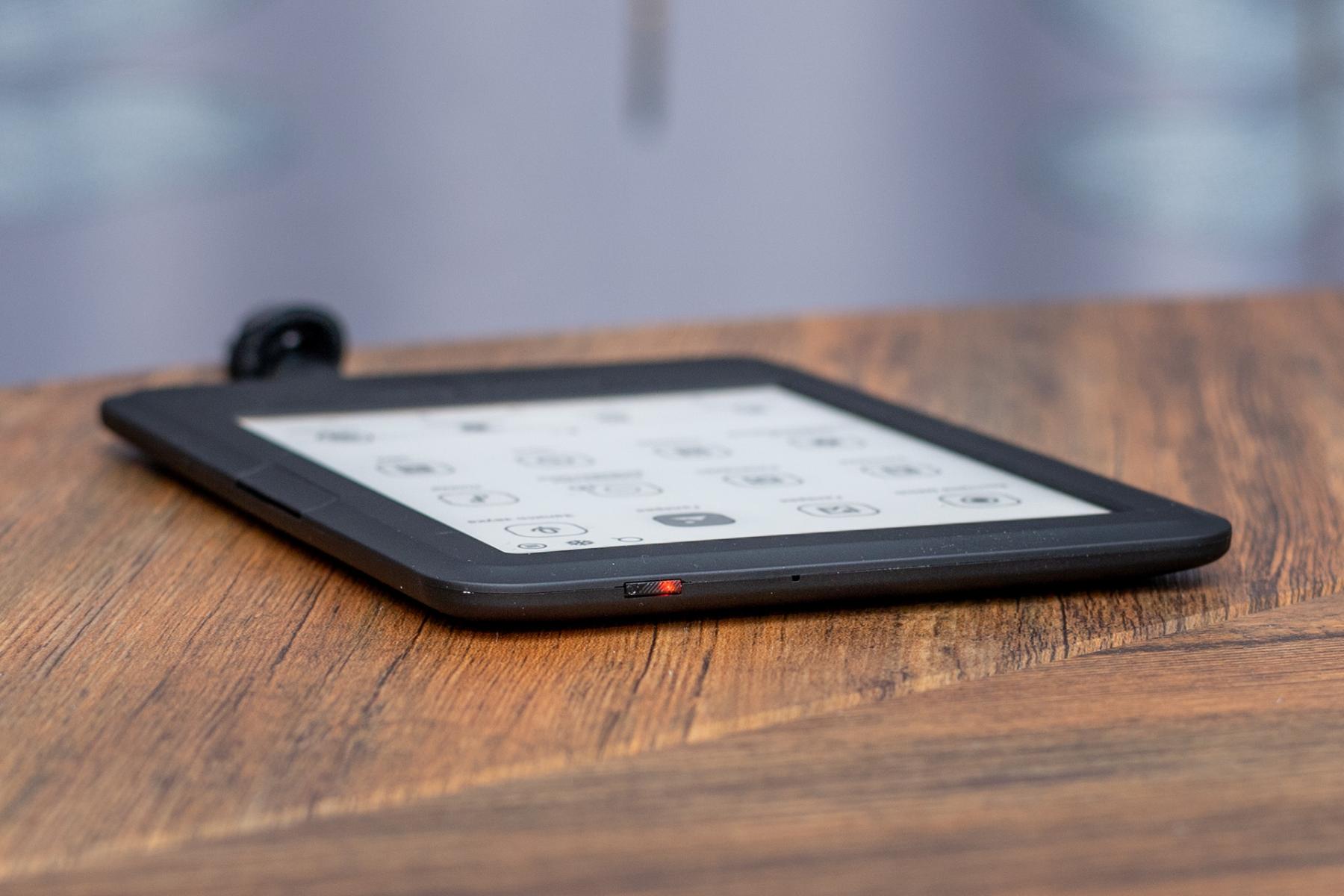 На верхней грани есть кнопка включения со светодиодным индикатором, работающим во время зарядки ридера и при его включении. Находящееся рядом отверстие либо не используется, либо служит для перезагрузки устройства, хотя достаточно будет зажать кнопку.