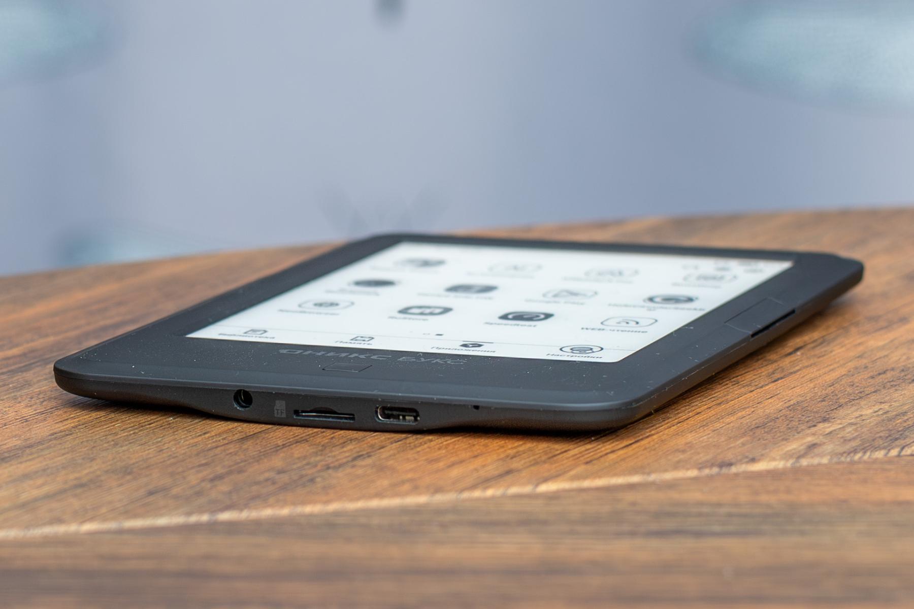 Снизу, что приятно, у Оникс Букс Дарвин 11 есть как современный разъём Type-C (USB 2.0) для зарядки и подключения некоторых гаджетов за счёт поддержки USB OTG, так и слот для карточки памяти microSD (microSDHC и microSDXC) и разъём 3.5 для проводных наушников. Если вы любите слушать аудиокниги, то подобный функционал не кажется избыточным, к тому же динамиков у ридера нет, а многочасовые аудиофайлы могут занимать немало места в памяти устройства. Интересно что работают наушники и при подключении к USB-C – знаю, что в смартфонах с мини-джеком обычно такого не происходит. Рядом находится микрофон для записи одноканального звука – не самого плохого по качеству надо сказать.