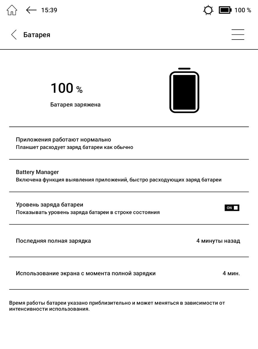 Полная зарядка ридера заняла чуть менее 3 часов (28% за 30 минут) – всё потому, что большую часть времени мощность зарядки составляет примерно 7 Вт, так что будет достаточно блока питания на 10 Вт (ничего страшного, если мощность будет выше). Здесь всё как в некоторых гораздо более старых моделях производителя. Поскольку поддерживается USB OTG, то возможна обратная зарядка – её мощность около 2.5 Вт.