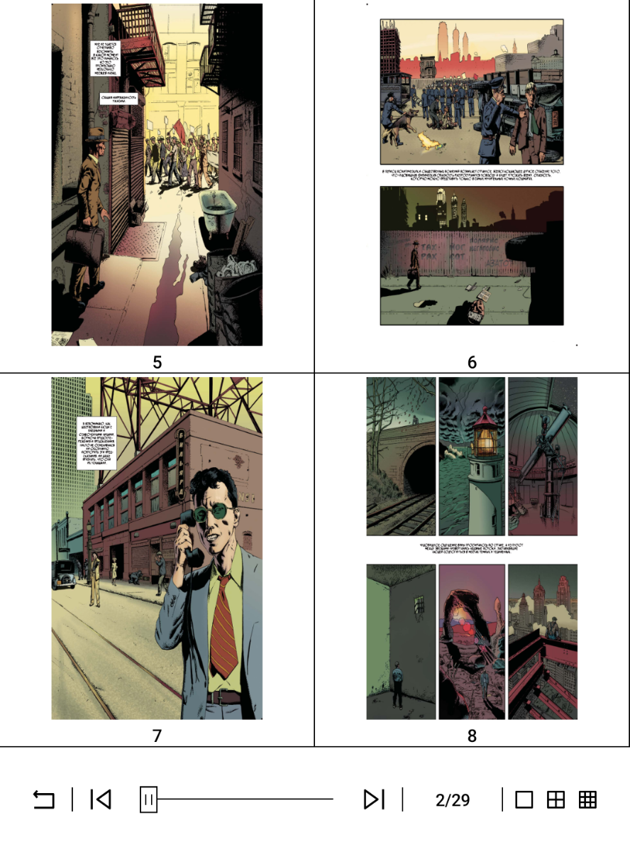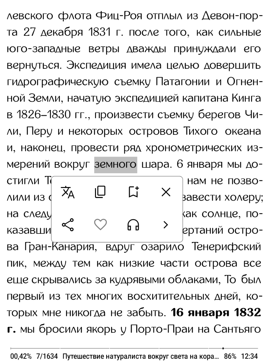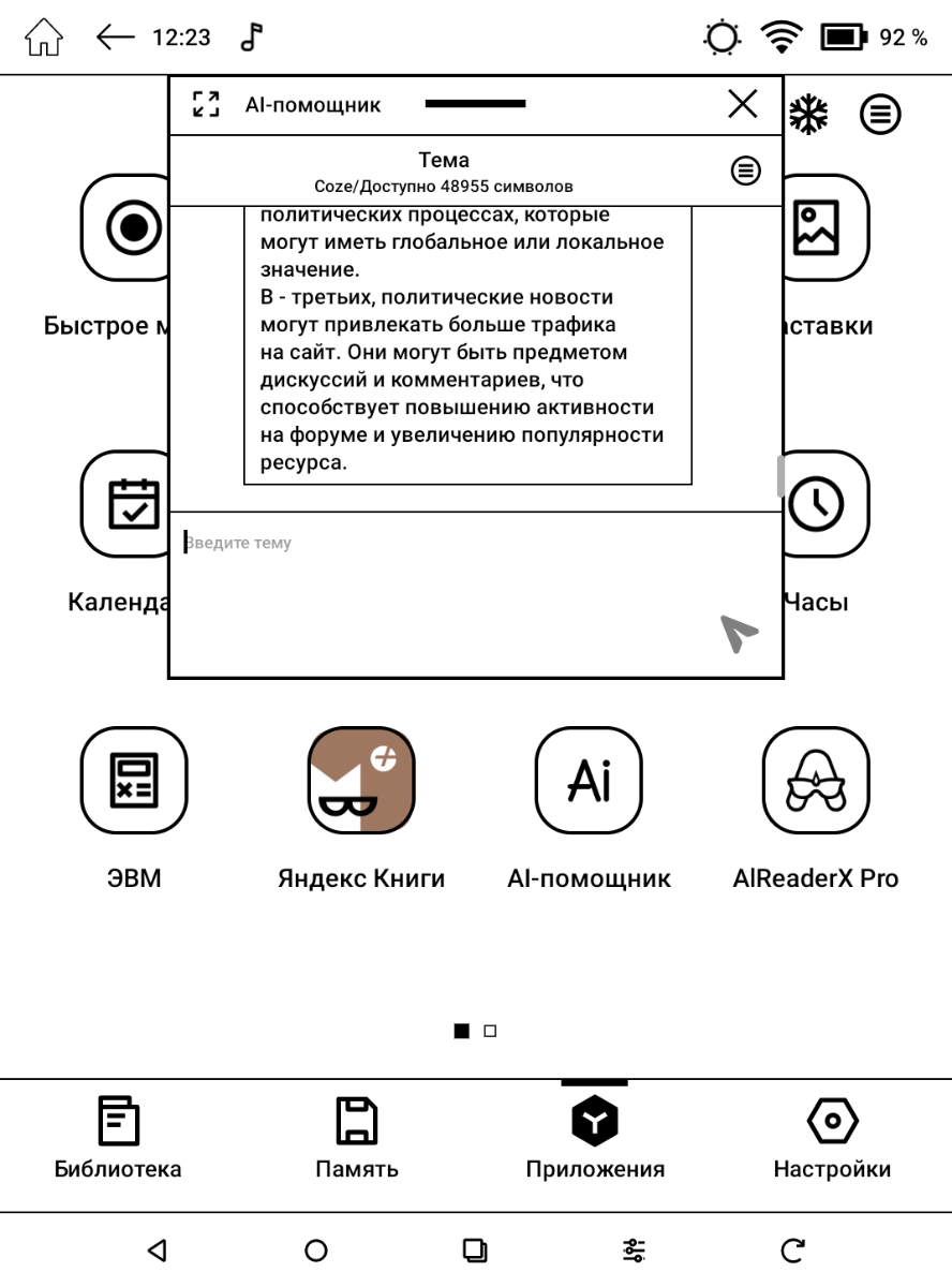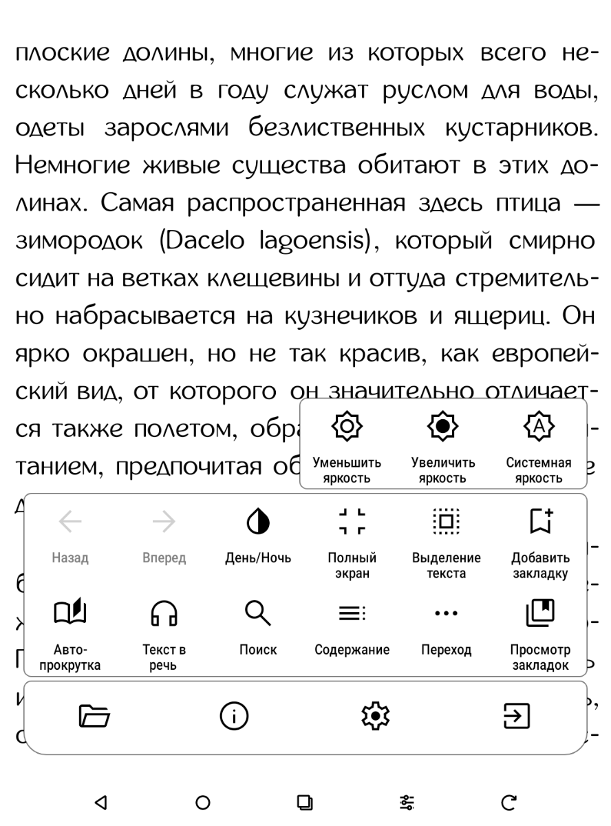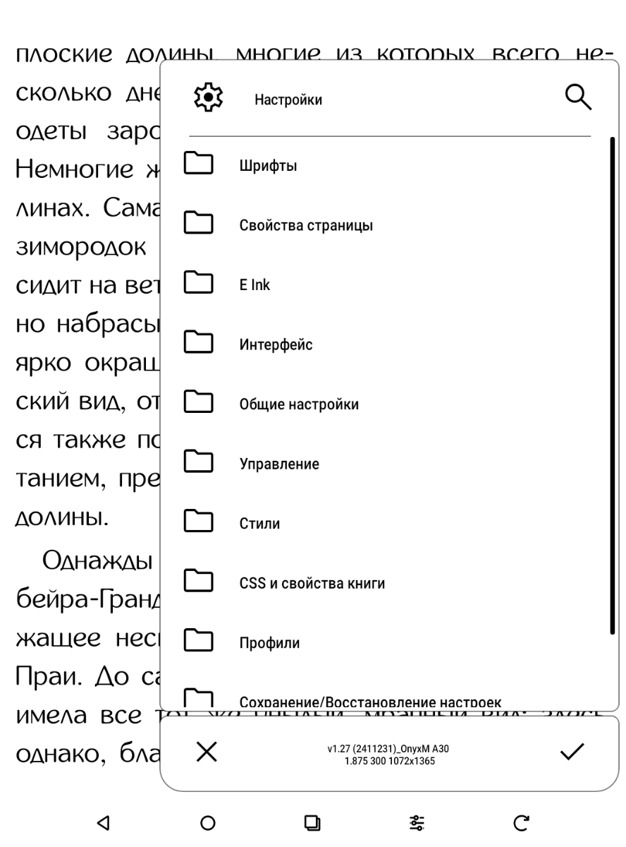 AlReaderX Pro по сравнению с предыдущим вариантом поддерживает гораздо большее количество форматов различных книг, в том числе FB3 и файлы в архивах, а вот с PDF, DjVu и изображениями работать уже не умеет. Представлено огромное количество настроек, большинством из которых, впрочем, пользуются только требовательные пользователи, желающие настроить абсолютно всё под себя. Замечены функции озвучивания текста и регулировки яркости подсветки через жесты по бокам экрана, а вот автопрокрутка страниц реализована не так как в Neo Reader 3.0 – происходит постепенное обновление информации, а не быстрое перелистывание всей страницы. Есть переключение на тёмный фон страниц, хотя для чтения в темноте его уже, на мой взгляд, не обязательно использовать. Быстрого вызова AI-помощника здесь не оказалось.