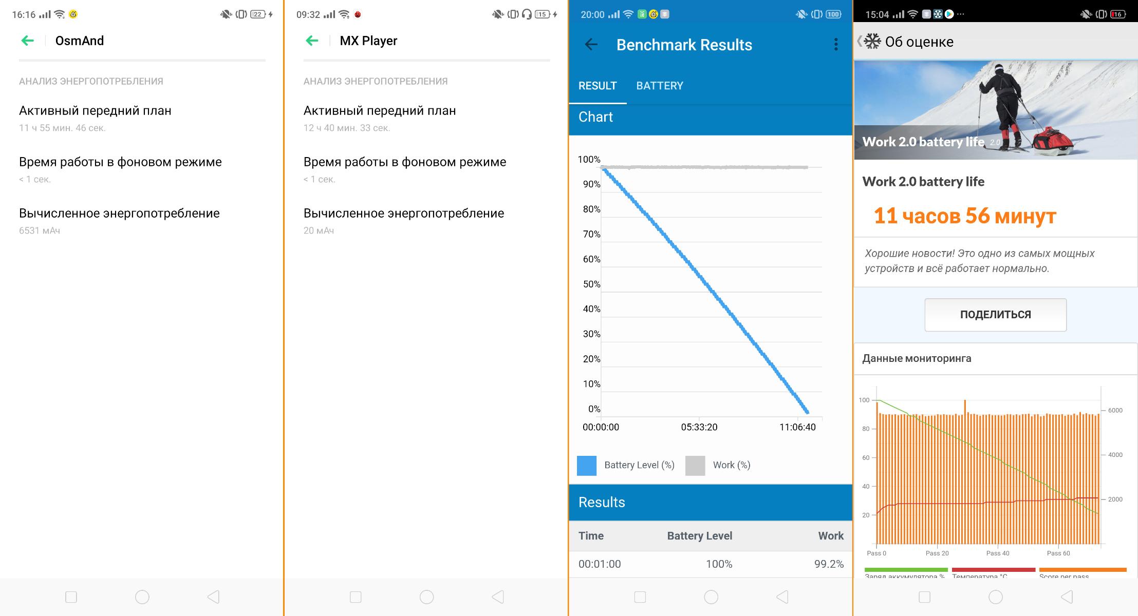 - Тест GeekBench 4 на минимальной яркости - 11 часов 43 минут.