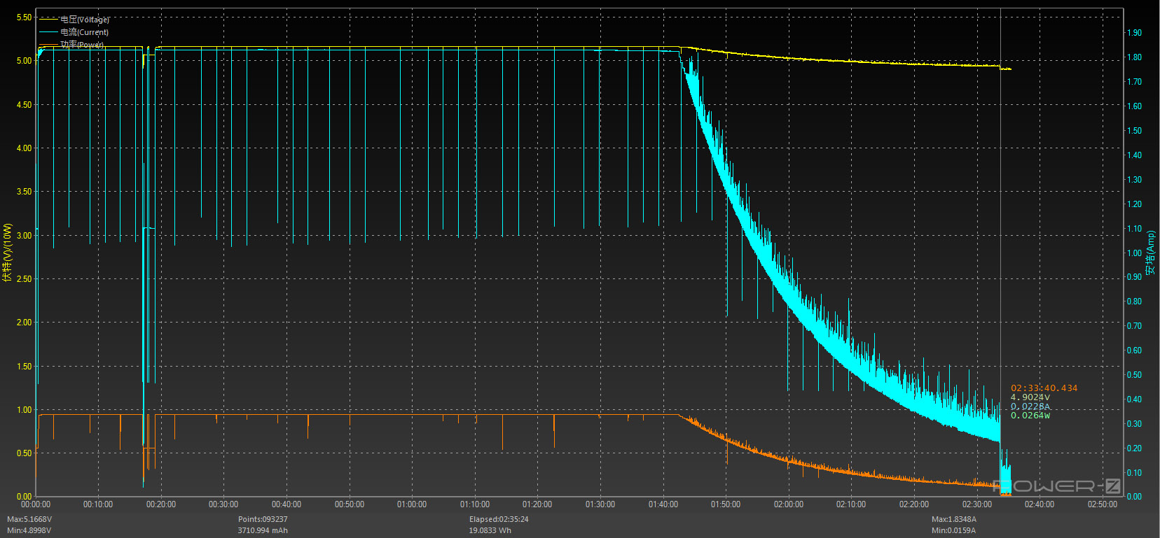От блока питания, который я обнаружил в коробке, смартфон заряжается с максимальными показателями примерно 5.16 Вольт и 1.83 Ампер, что в сумме даёт мощность 9.44 Вт. Таким образом, если заряжать смартфон БП, выдающим напряжение 5 В и ток 2 А, то время зарядки составит 2 часа 33 минуты. У других пользователей на полную зарядку уходит примерно 1 час 20 минут, но им наверняка досталось другое зарядное устройство, действительно поддерживающее быструю зарядку VOOC 3.0.