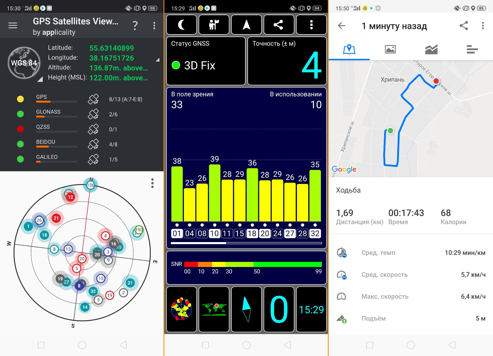 Смартфон видит все известные виды спутников, а вот время, необходимое для холодного старта только по спутникам, засечь не удалось. Дело в том, что смартфон изначально требует запустить все дополнительные службы для более точной навигации, и только потом даёт возможность их отключить, что сильно влияет на результаты теста. GPS-треки получаются ровными, а кроме того в аппарате есть компас. В целом никаких проблем при навигации в городских условиях выявить не удалось.