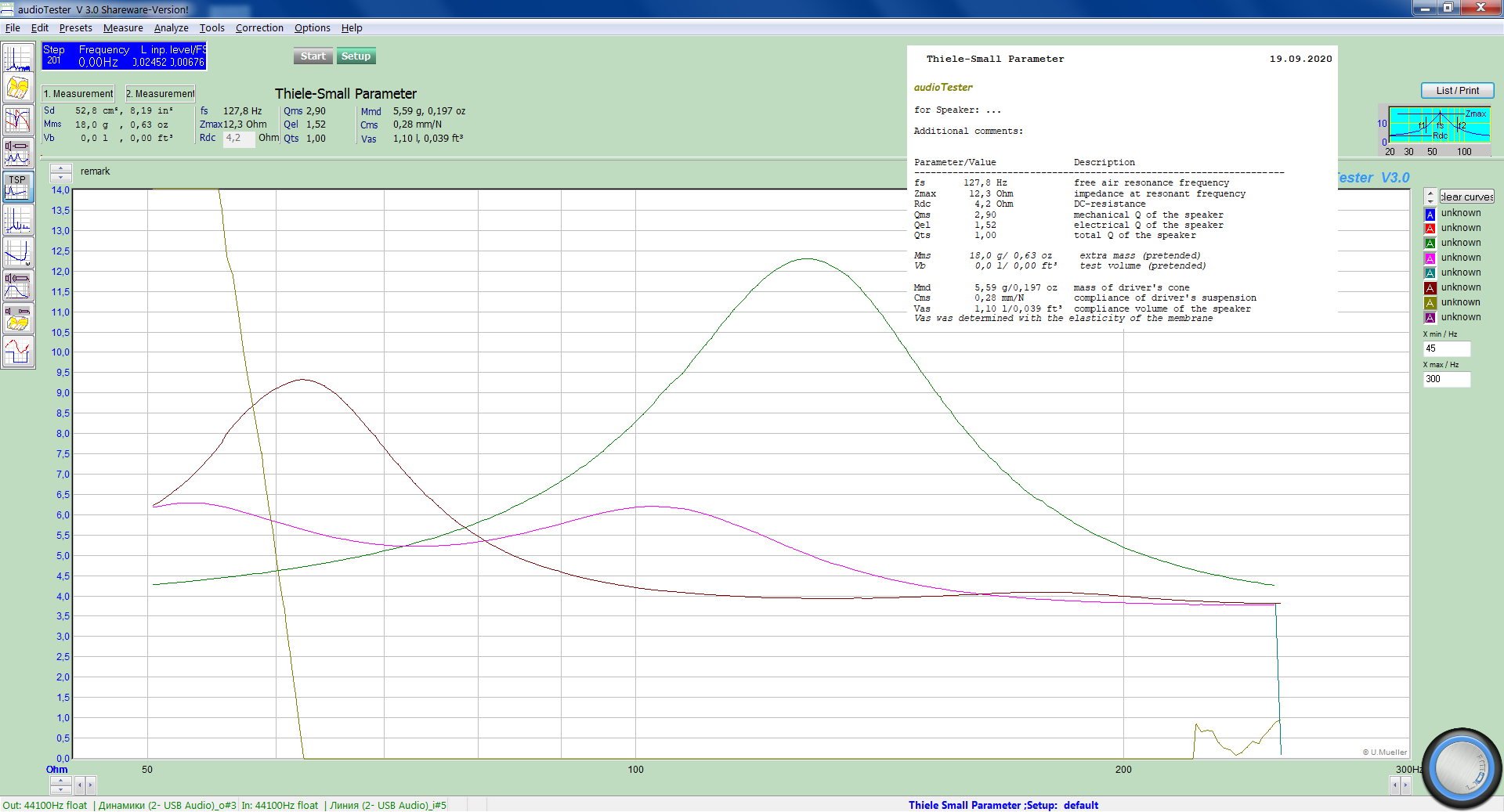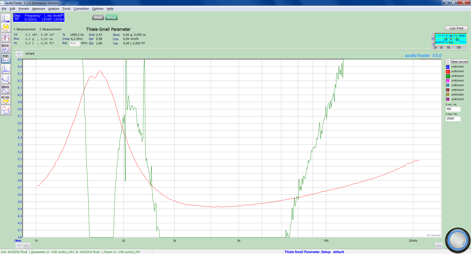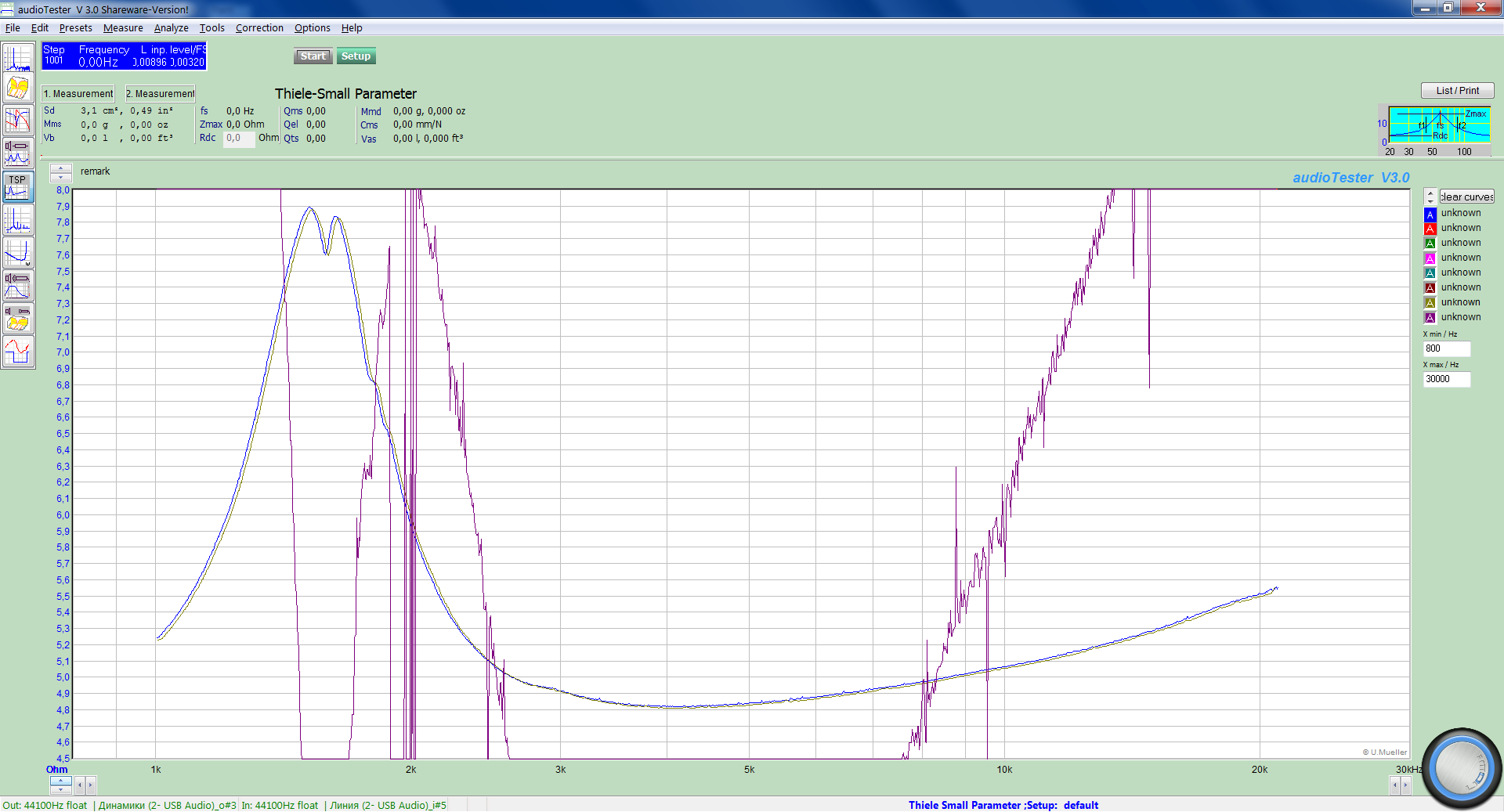Использовалось условно бесплатное программное обеспечение AudioTester v 3.0 вместе с внешней звуковой картой Creative Sound Blaster модель SB0270. Основные параметры определялись методом добавочной массы (использовалось кольцо из пластилина калиброванной массы 18 грамм) и балластный резистор сопротивлением 10 Ом (ТОЧНОСТЬ 0,5%).