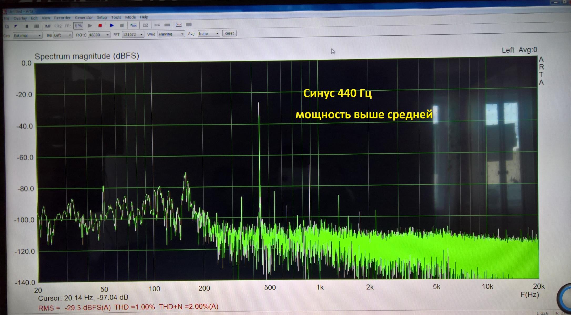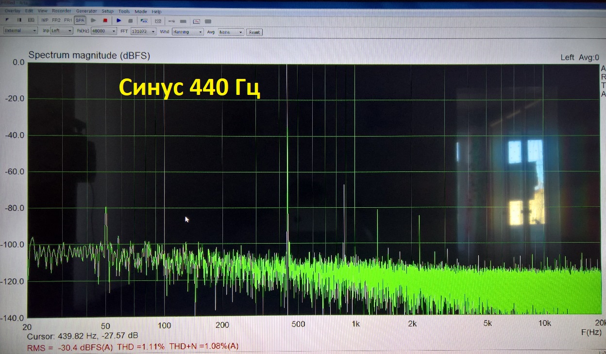Не сохранил картинку, где при аналогичном уровне громкости подавался синус с частотой 50 Гц - ARTA зафиксировала 5,68% THD.