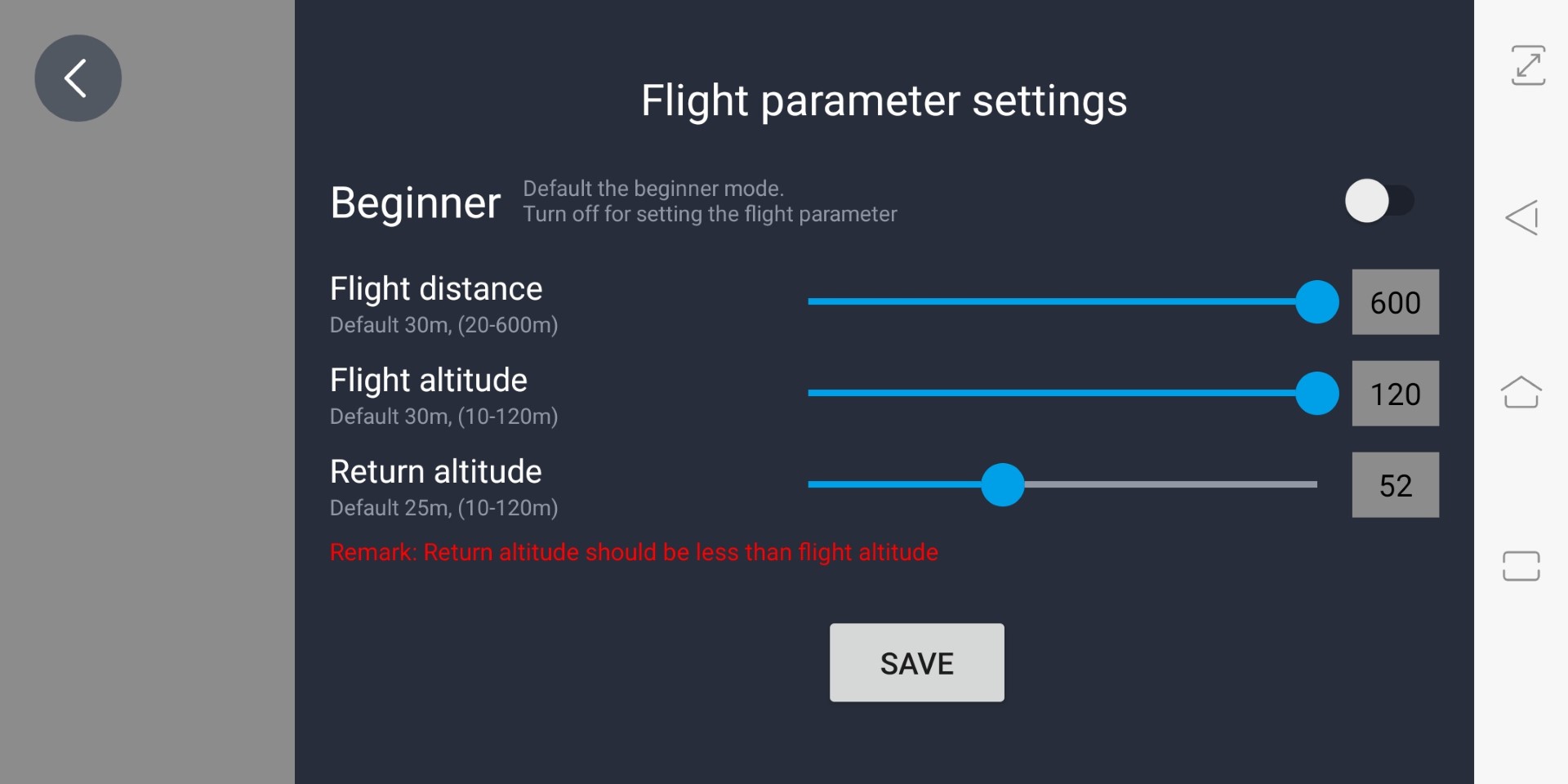 Теперь пришло время затестить SJRC Z5 на полную. Заходим в настройки, убираем чекбокс «Beginner» и выставляем дальность на максимальные 600 метров и высоту на 120. Параметр «высота возврата домой» рекомендую поставить повыше – метров 50.