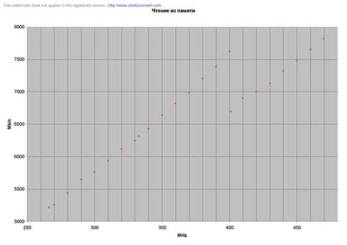 Как известно переключение strapa влияет прежде всего на работу подсистемы памяти. Поэтому я решил протестировать латентность памяти и скорость чтения из памяти утилитой Everest v.4.00.976 при всех возможных частотах FSB.
