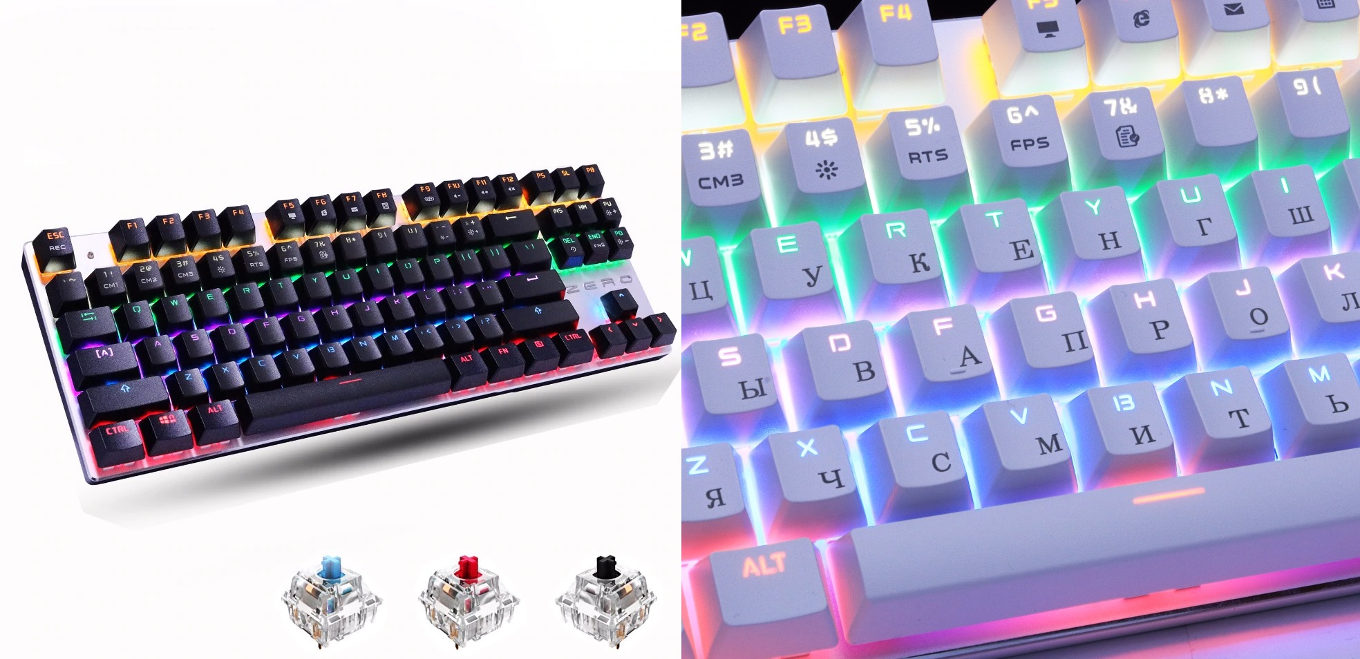Это очень популярная клавиатура на Aliexpress имеет около семи тысяч продаж. По принципу работы кнопок это механическая клавиатура. Она имеет очень продуманную конструкцию в виде «скелетон», что позволяет легко и быстро очистить ее от накопившегося со временем мусора. Есть возможность заказать с доставкой с РФ. Как всегда, есть разные режимы подсветки и несколько цветовых решений. При заказе будьте внимательны, есть клавиатуры, как с русской раскладкой, так и без нее.
